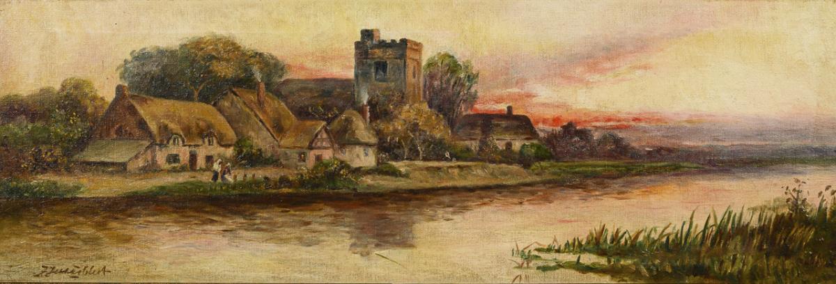 Reetgedeckte Häuser mit Kirche am Ufer bei Sonnenuntergang.