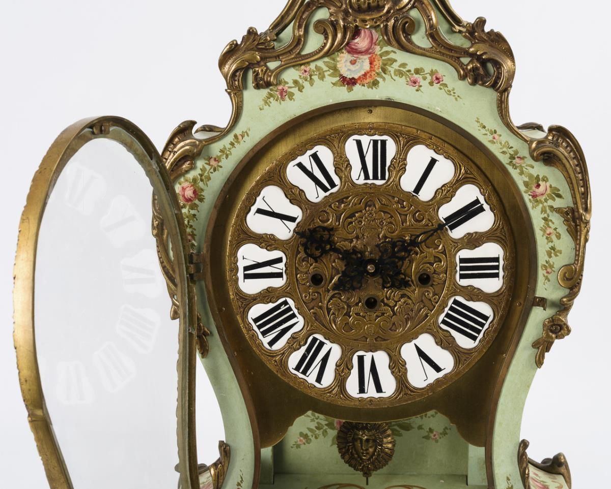 Rocailliertes, 3-seitig verglastes Gehäuse mit reichen Bronzeapplikationen und einer bekrönenden Frauenfigur als Allegorie des Sommers (Ceres). Leichte Alters- und Gebrauchsspuren. Nachtrag vom 06.10.22: Frontscheibe gesprungen.