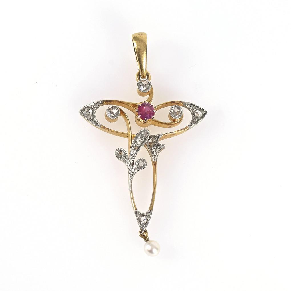 Jugendstilanhänger mit Rubin?, Altschliffdiamanten und Perlchen.