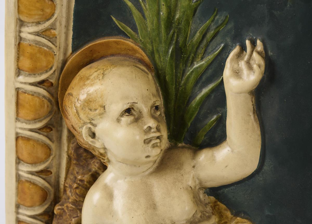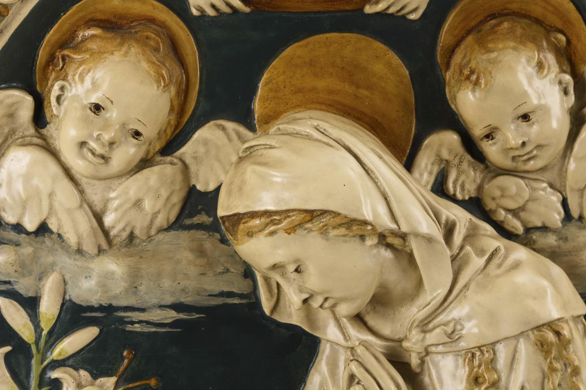 Auch Lilienmadonna (Madonna dei gigli) genanntes Relief, dessen Original kurz vor 1500 entstand. Einige Haarrisse im Randbereich, 1 rückseitige Verstärkung, sonst kaum Alters-/Gebrauchsspuren.