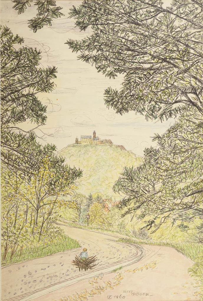 Blick zur mittelalterlichen Burg nahe Eisenach mit Staffage auf der Straße.