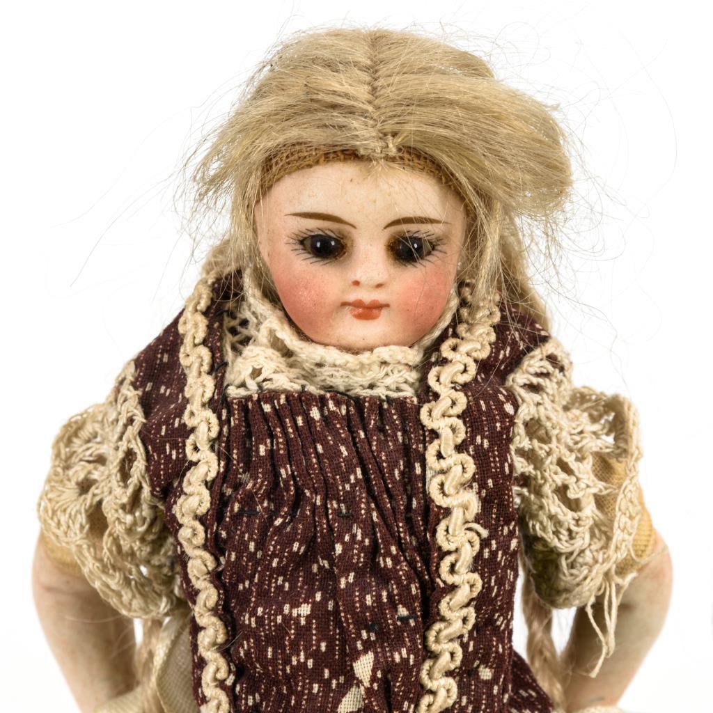 Defekter Brustkopf, feste braune Glasaugen, geschlossener Mund, blonde Mohairperücke. Stoffkörper mit Porzellangliedern. Braun gemustertes Kleid, modellierte Schuhe. Dazu kleine Schachtel mit lithografiertem Deckelbild und aufgeklebten Muscheln, darin jüngere Garnröllchen.
