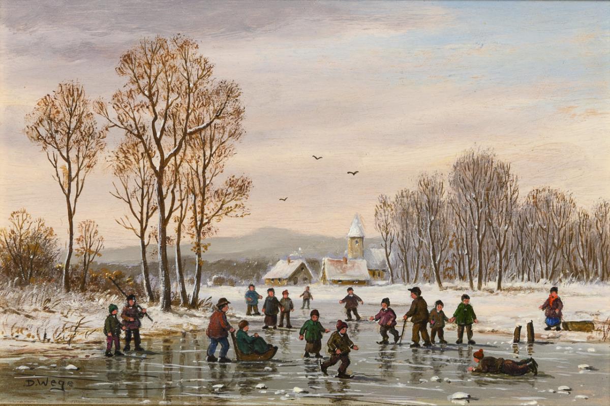 Viele Kinder beim Spielen auf dem gefrorenen See an einem schönen Wintertag.