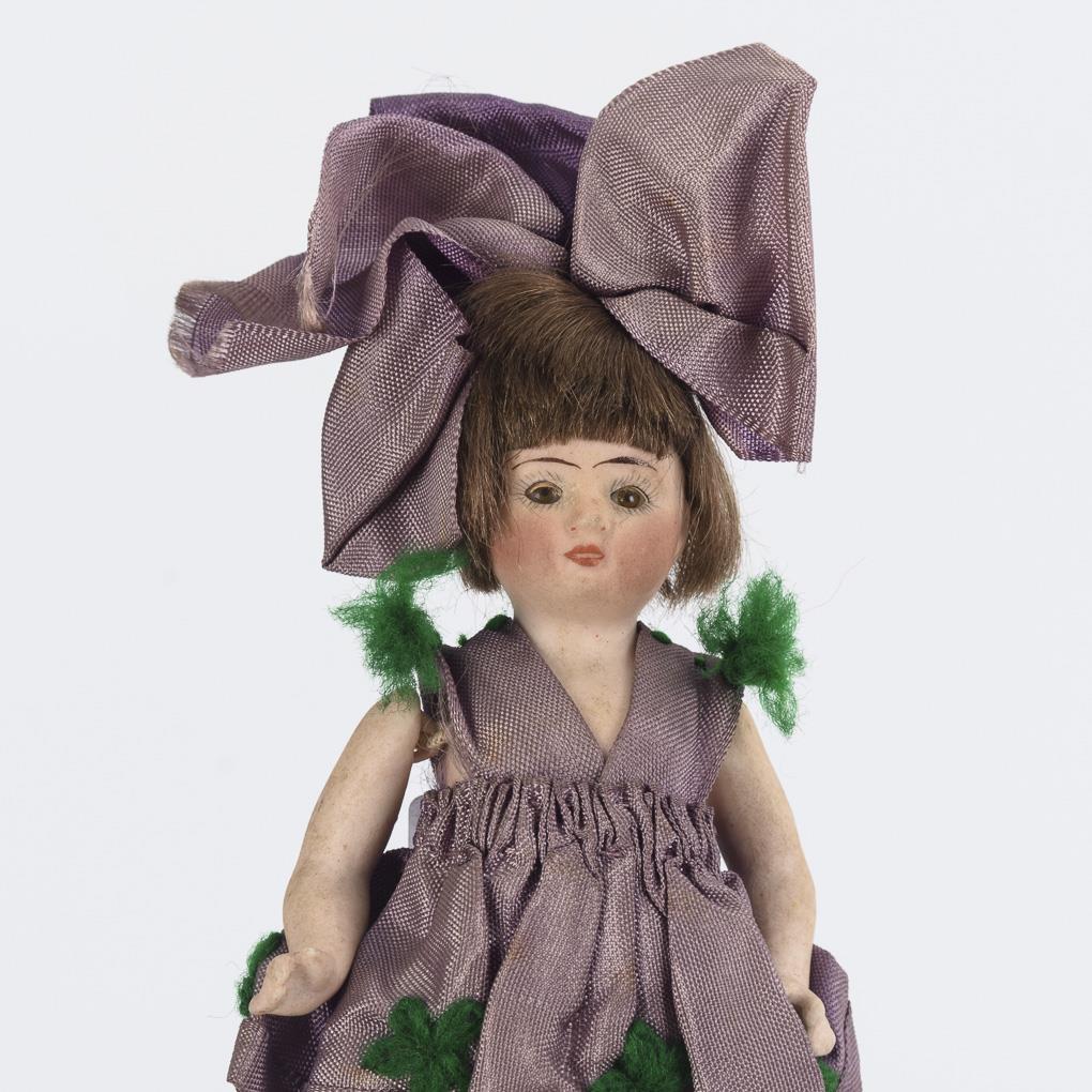 Ganzbiskuit-Püppchen mit festem Kopf, braunen Mohairhaaren, modellierten Schuhen und gemalten Strümpfen. 1x in hellem, 1x in violettem Kleid. Ohne sichtbare Defekte, das größere Püppchen mit locker gespannten Gliedern.