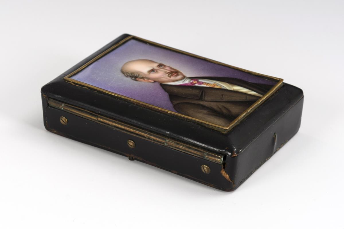 Lackdose mit Scharnierdeckel. Auf dem Deckel eine Porzellanplakette mit dem Porträt des Erzherzogs Johann von Österreich (1782-1859). Tabatiere defekt.