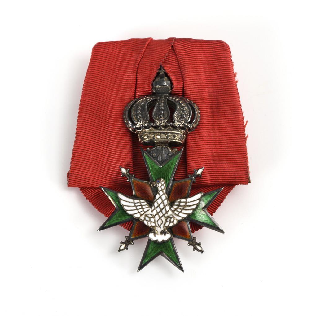 Hier Ausführung des Ritterkreuzes der 2. Klasse in Silber, für zivile Verdienste. Krone und Kreuz sind durch eine kleine Achse beweglich gelagert. Rotes Bogenband.