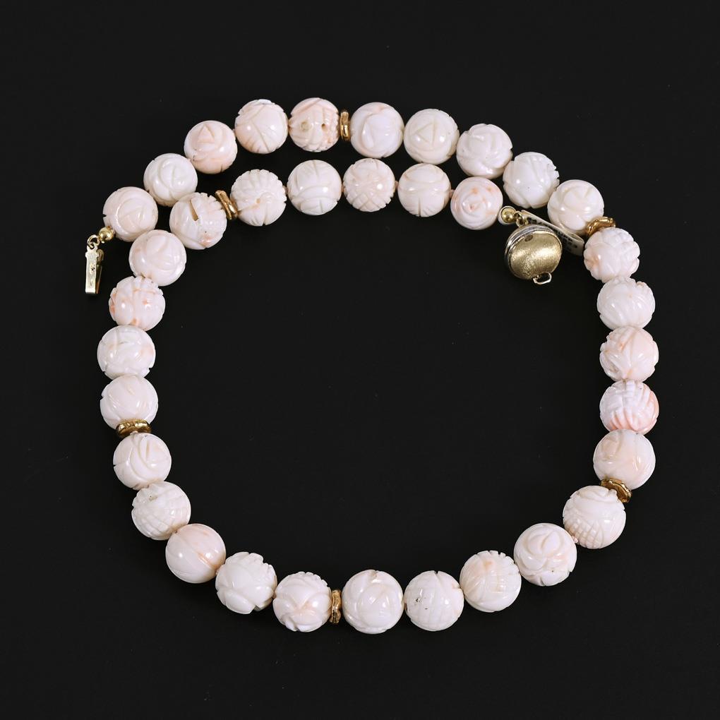 Gelbgold/Weißgoldschließe 585 gestempelt. L 46 cm. Korallen Ø 1,3 cm. 88 g.