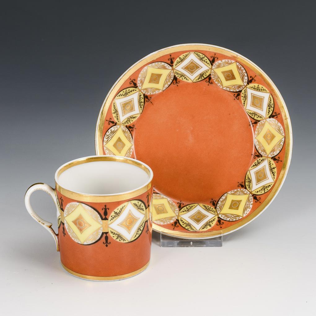 Zylindertasse mit Ohrenhenkel. Orangeroter Fond mit Ornamentmedaillons mit zitronengelbem Teilfond sowie schwarzer und goldener Malerei.
