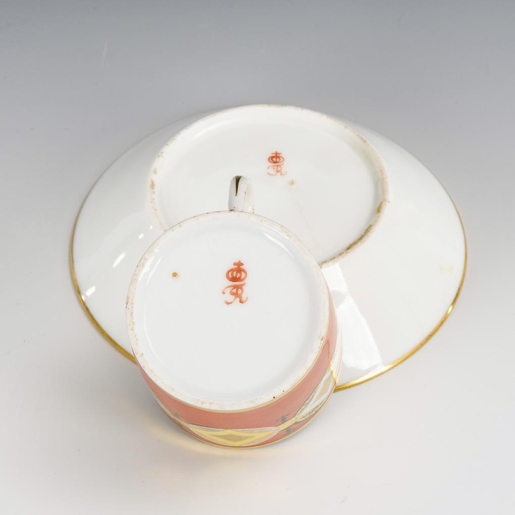 Polychrom bemalt, goldstaffiert. H Tasse 6 cm, Ø originale Untertasse 13 cm.