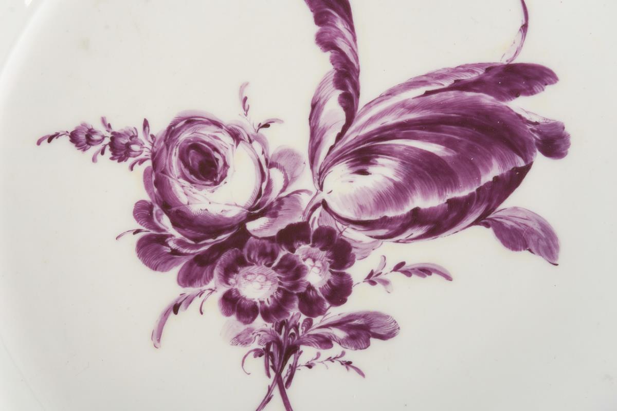 Mit reliefierten Rocaillekartuschen auf der Fahne sowie purpurfarbenen Blumenbuketts und Streublümchen. 1x Fahne etwas verzogen, minimaler Goldabrieb.