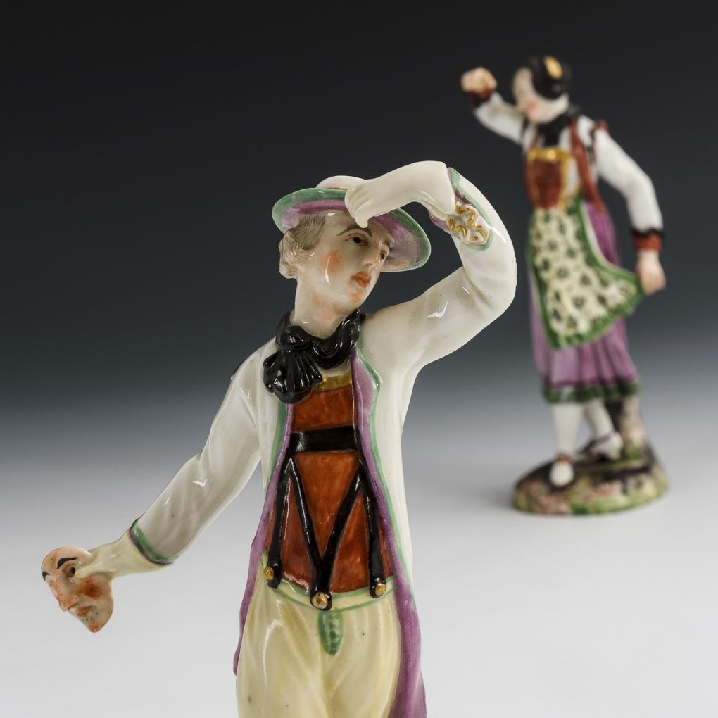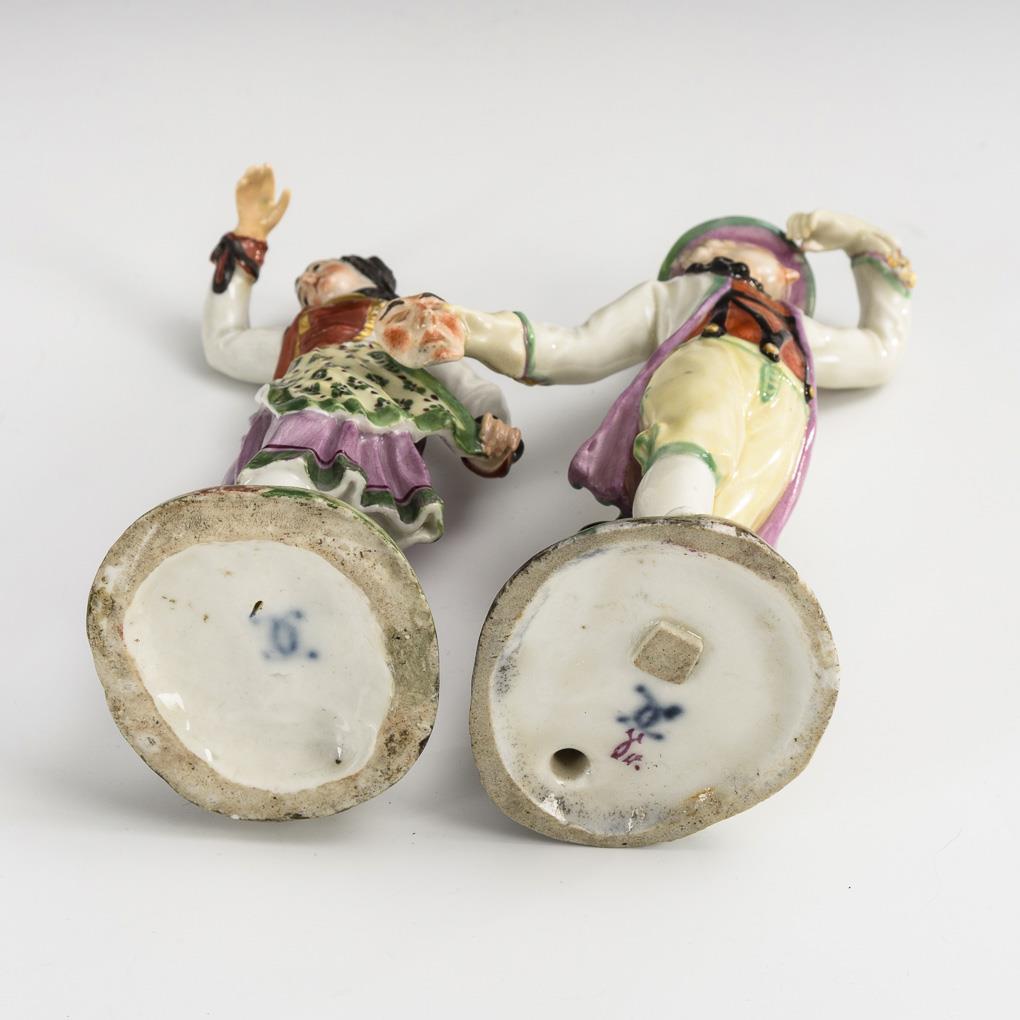 1x tanzende Frau in Trachtenkleidung: Entwurf von Johann Christoph Haselmeyer (gest. wohl 1771), 1766. / 1x tanzender Bauer mit Maske in der rechten Hand: Entwurf wohl von Joseph Nees (1730 Memmingen - 1778 ebd.), 1765/67. Tänzerin: rechte Hand und Finger der linken Hand restauriert, Maske fehlt; Tänzer: Hutrand restauriert.