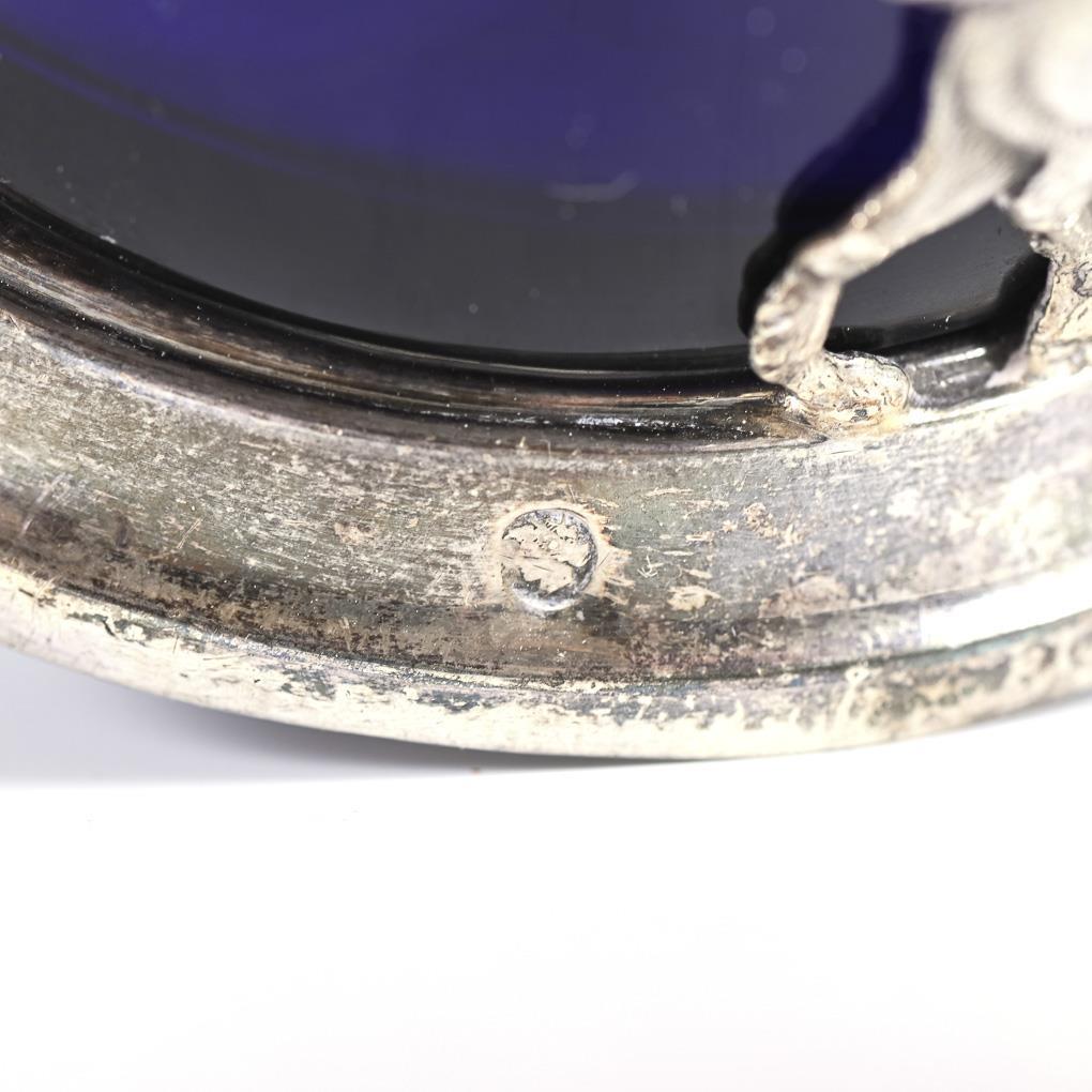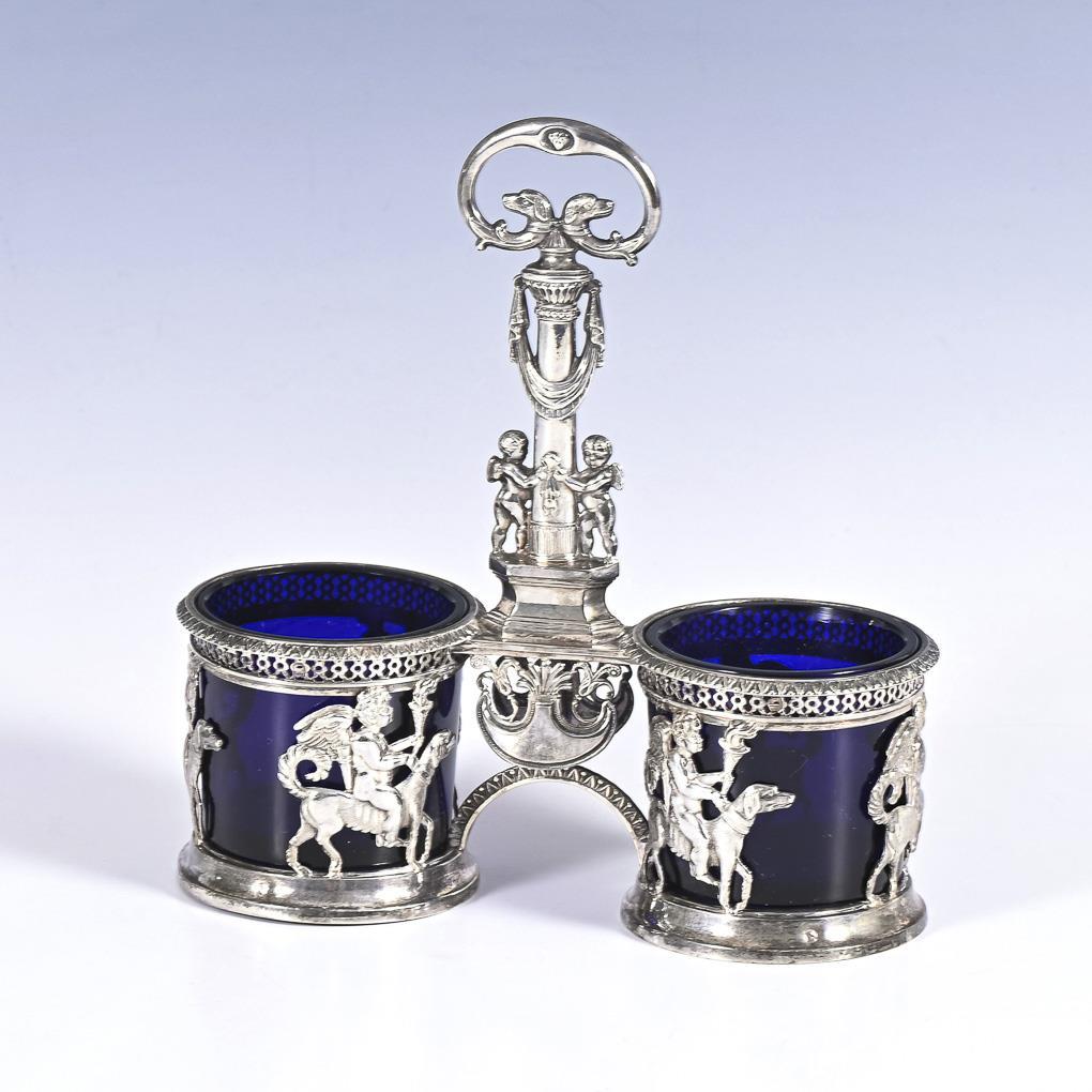 Doppelmenage mit Amor als Hundereiter und säulenförmiger Handhabe. Mit 2 Kobaltglaseinsätzen. Minimal gedellt, Glaseinsätze wohl jünger ergänzt.