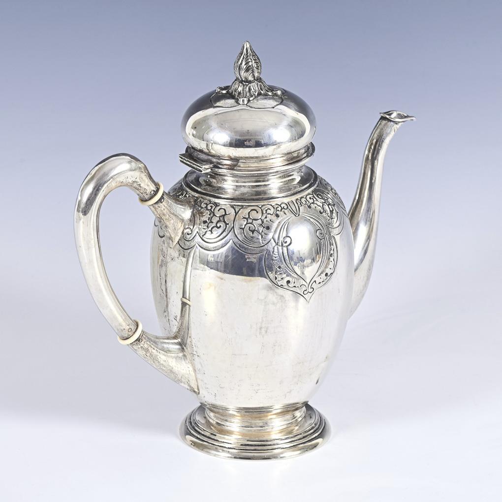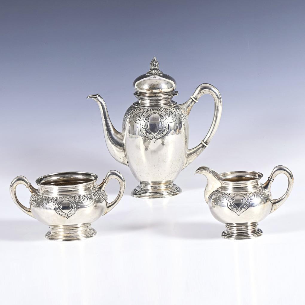Bauchige Form mit Reliefdekor: Kaffeekanne, Milchgießer und Zuckerschale. Minimale Gebrauchsspuren.