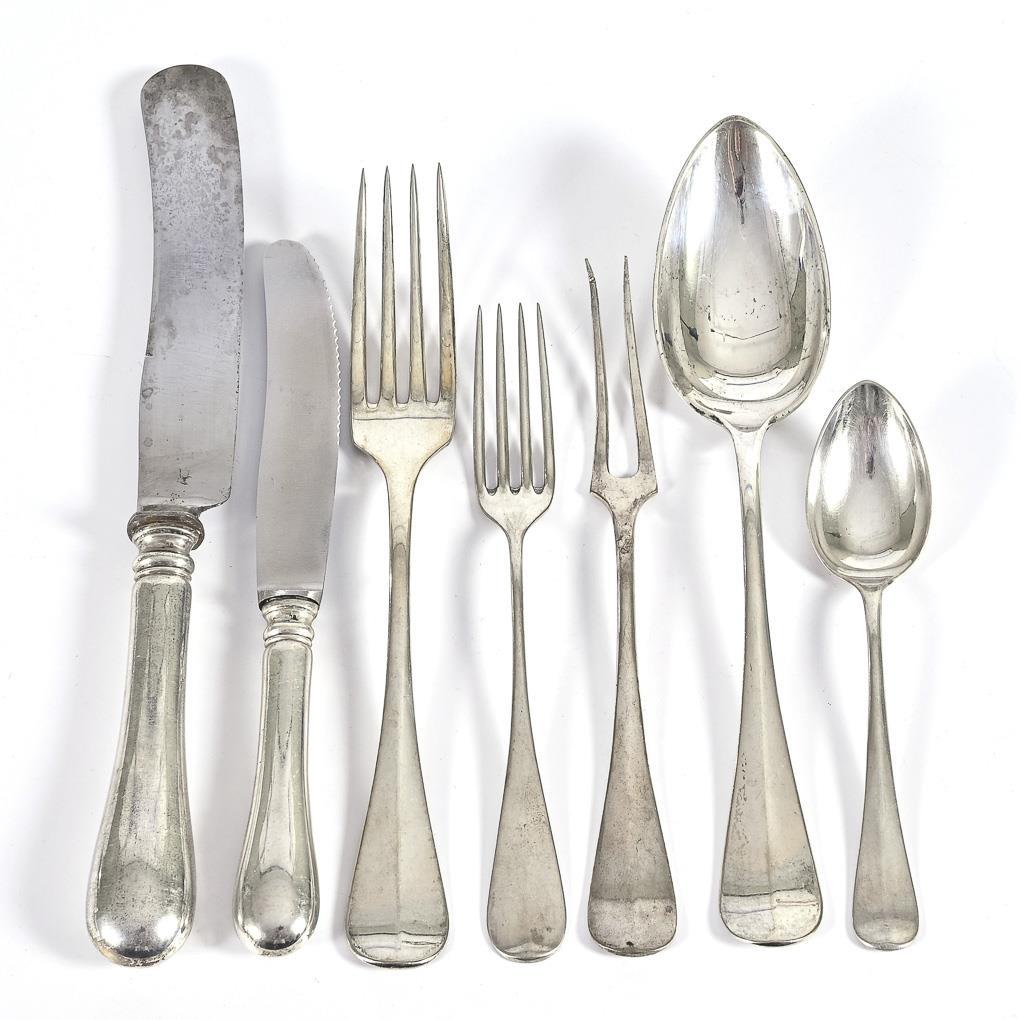 Glatte Form, mit verschlungener Monogrammgravur: 6 Menügabeln, 6 Menümesser, 6 Suppenlöffel, 12 kleine Gabeln, 12 kleine Messer, 11 Kaffeelöffel und 1 Fleischgabel. Minimale Alters- und Gebrauchsspuren.