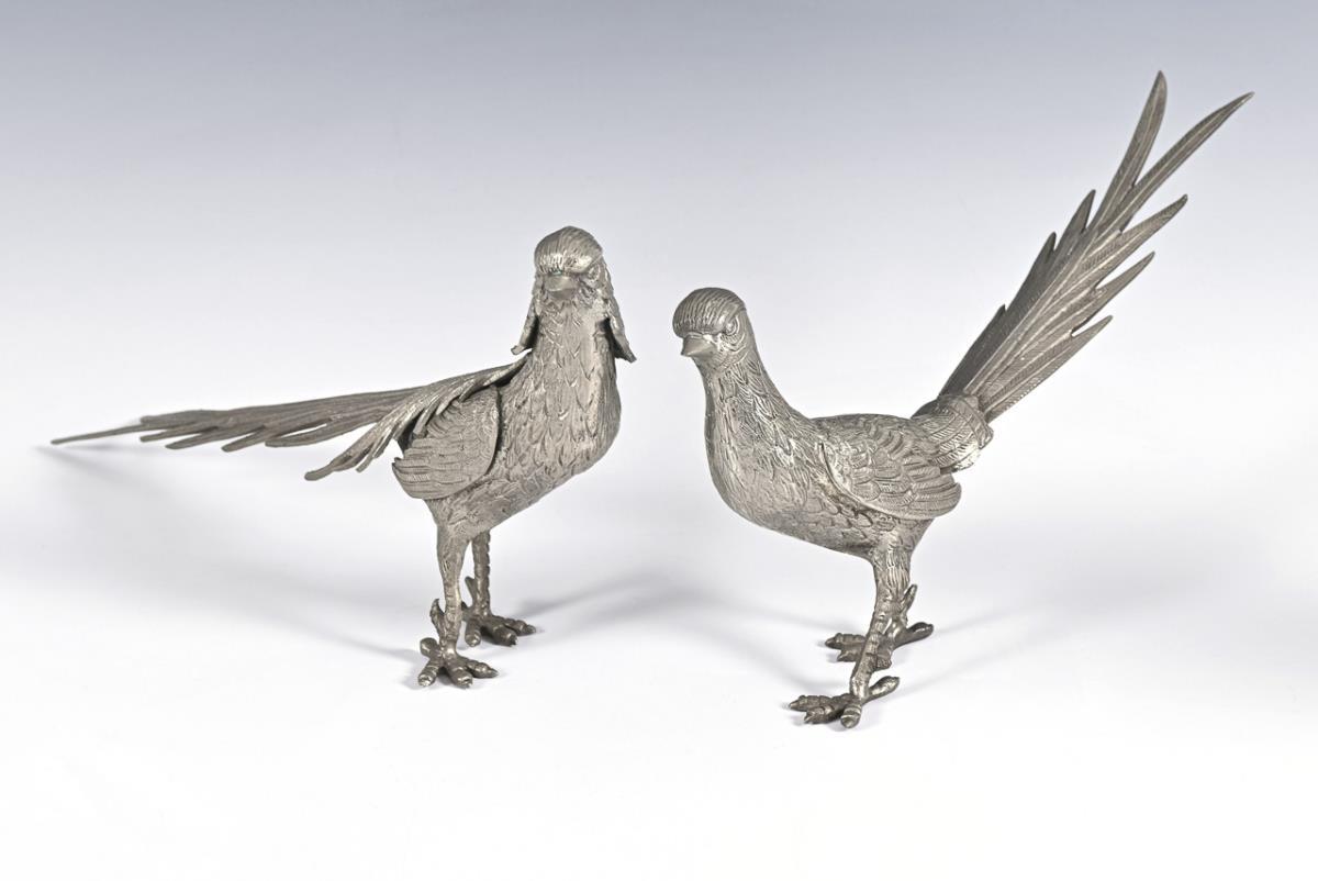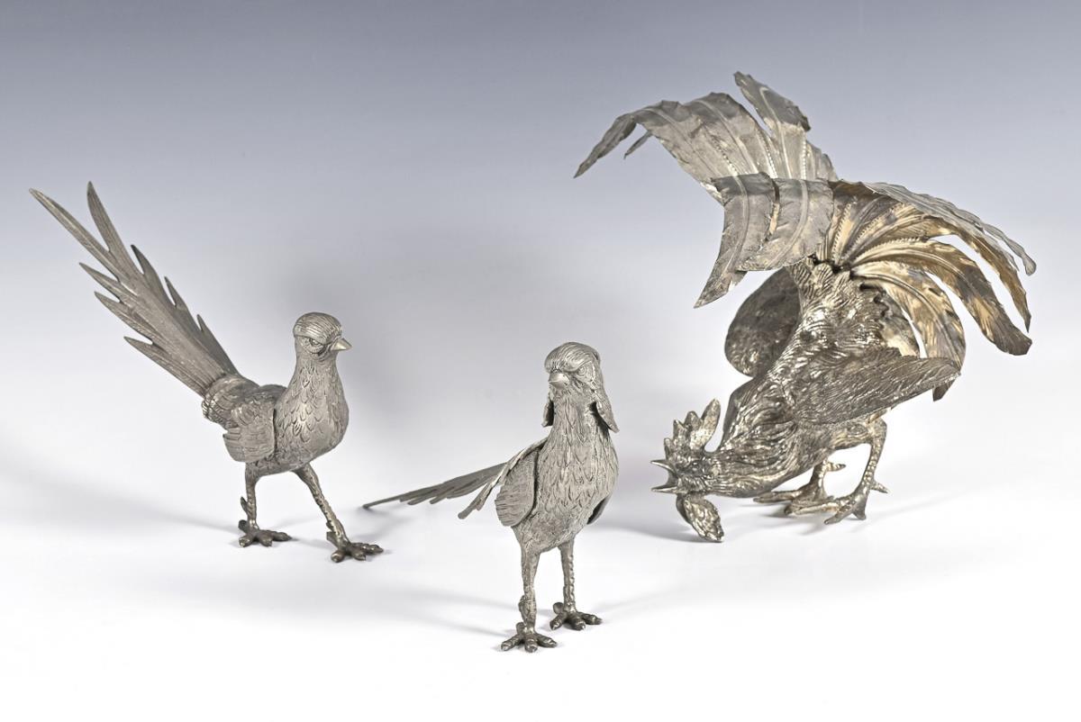 Wohl Tafeldekoration: Hahn mit aufgestelltem Schwanzgefieder und Goldfasanen-Paar. Einige Alters-/Gebrauchsspuren.