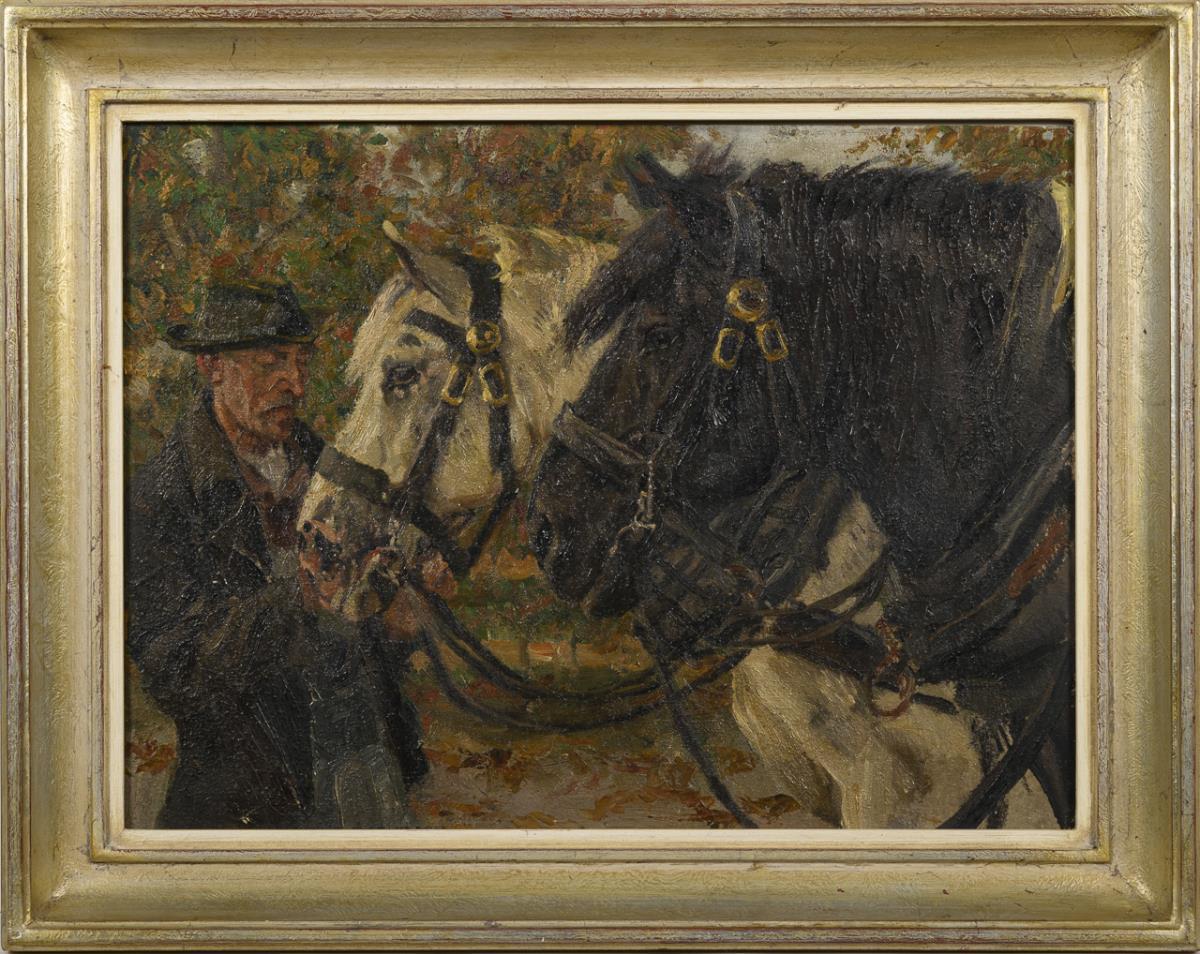 Älterer Bauer beim Anschirren der Tiere. Leichte Altersspuren.