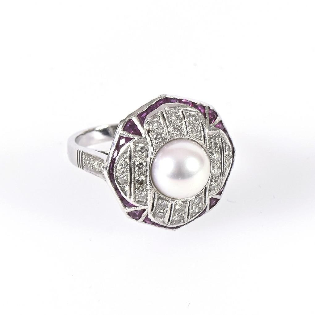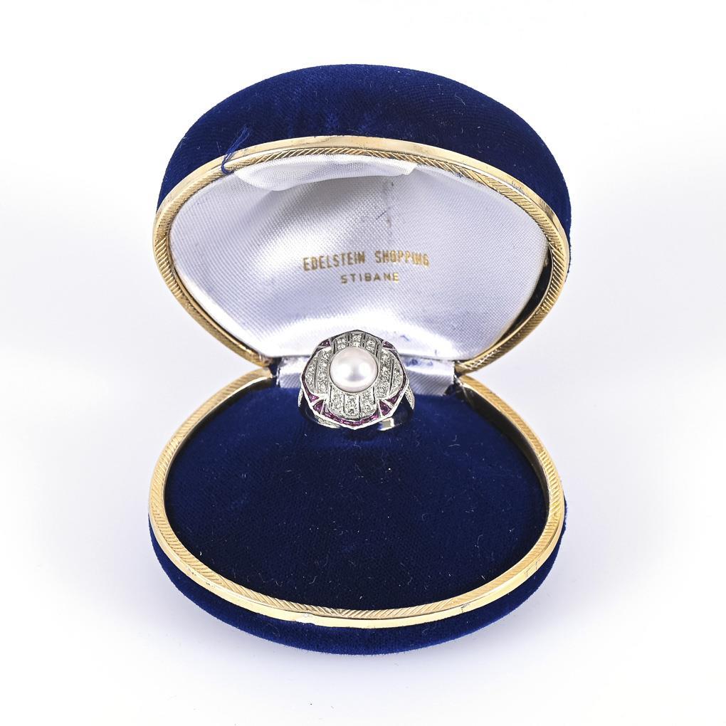 Ring mit Zuchtperle, Brillanten und Rubinen.