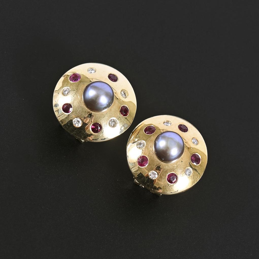 Ohrsteckerpaar mit Zuchtperlen, Brillanten und Rubinen.
