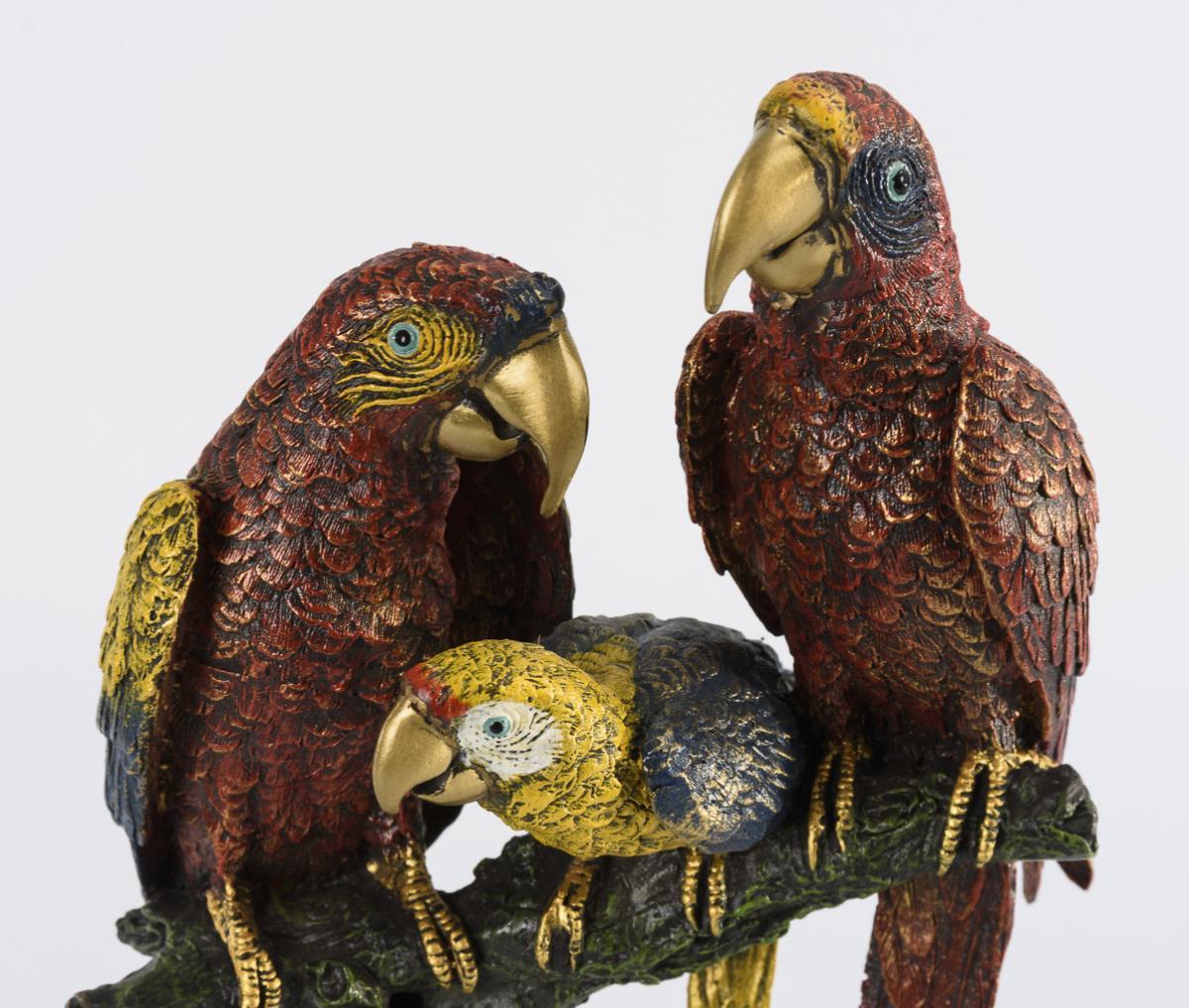 Auf einem Ast sitzende Aras in farbprächtiger und realistischer Gestaltung mit detailliert ausgeführten Federn.