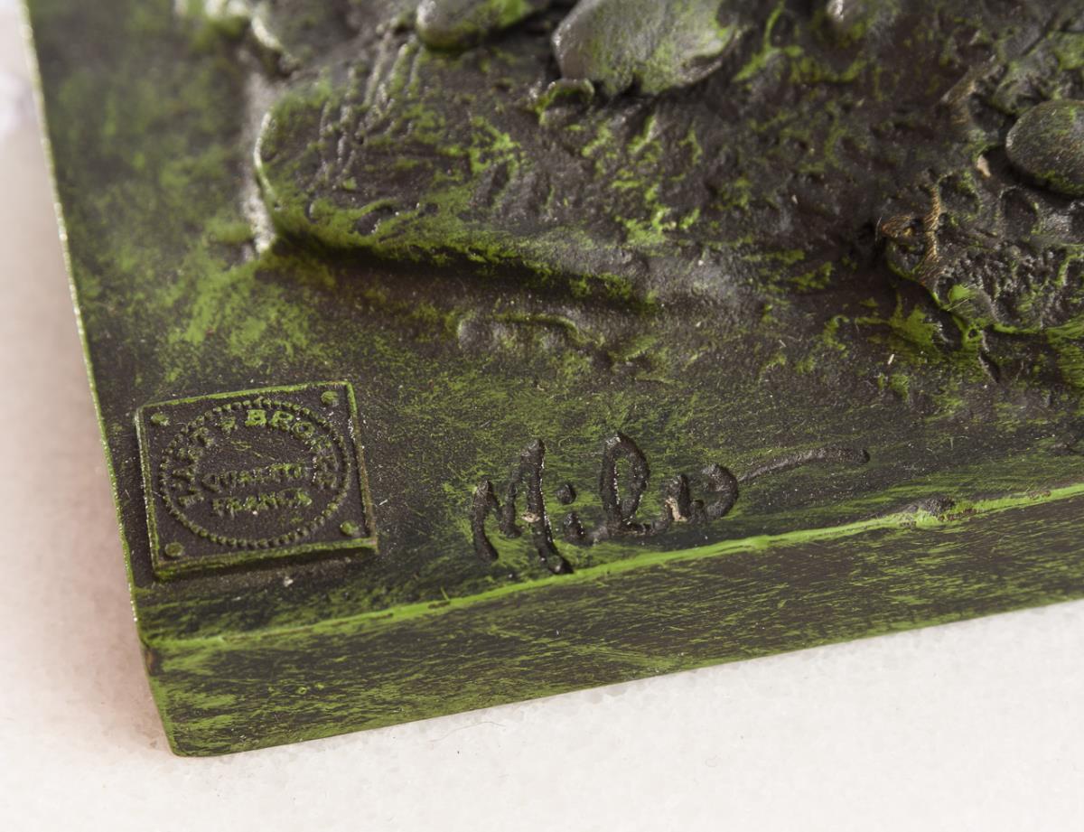 Bronze polychrom gefasst, weiße Marmor-Plinthe. Bezeichnet, Gießermarke "L'Art Bronze Qualité France". H 34 cm, gesamt 39 x 19 x 11 cm.