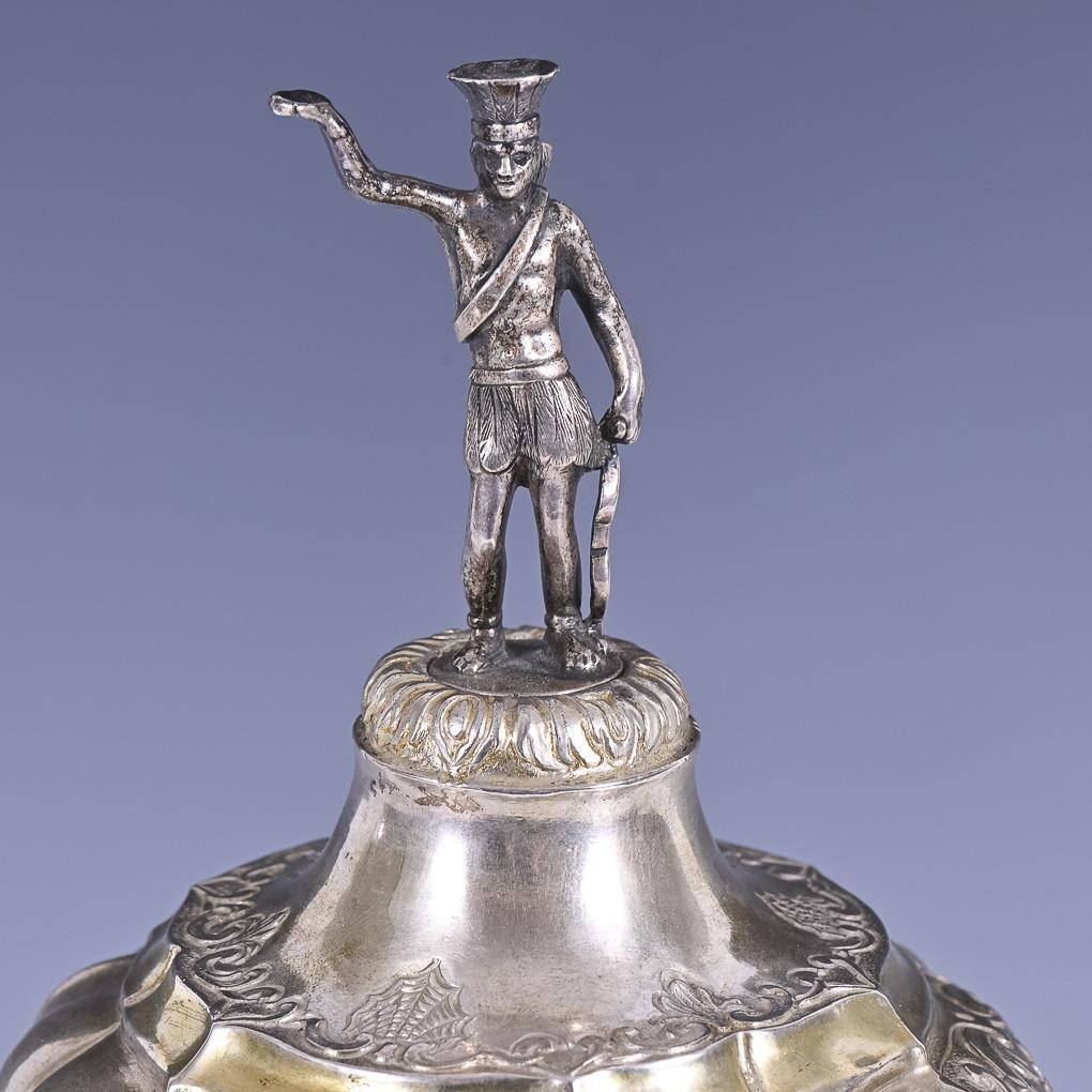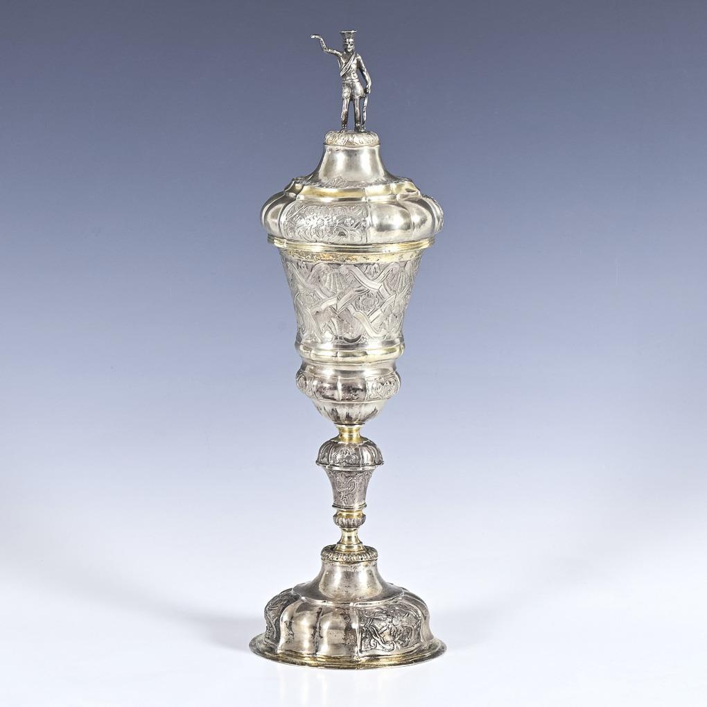 Reich verzierter Deckelpokal, sogenannter "Willkomm" mit getriebenem Reliefdekor und figürlichem Deckelknauf. Innen vergoldet.