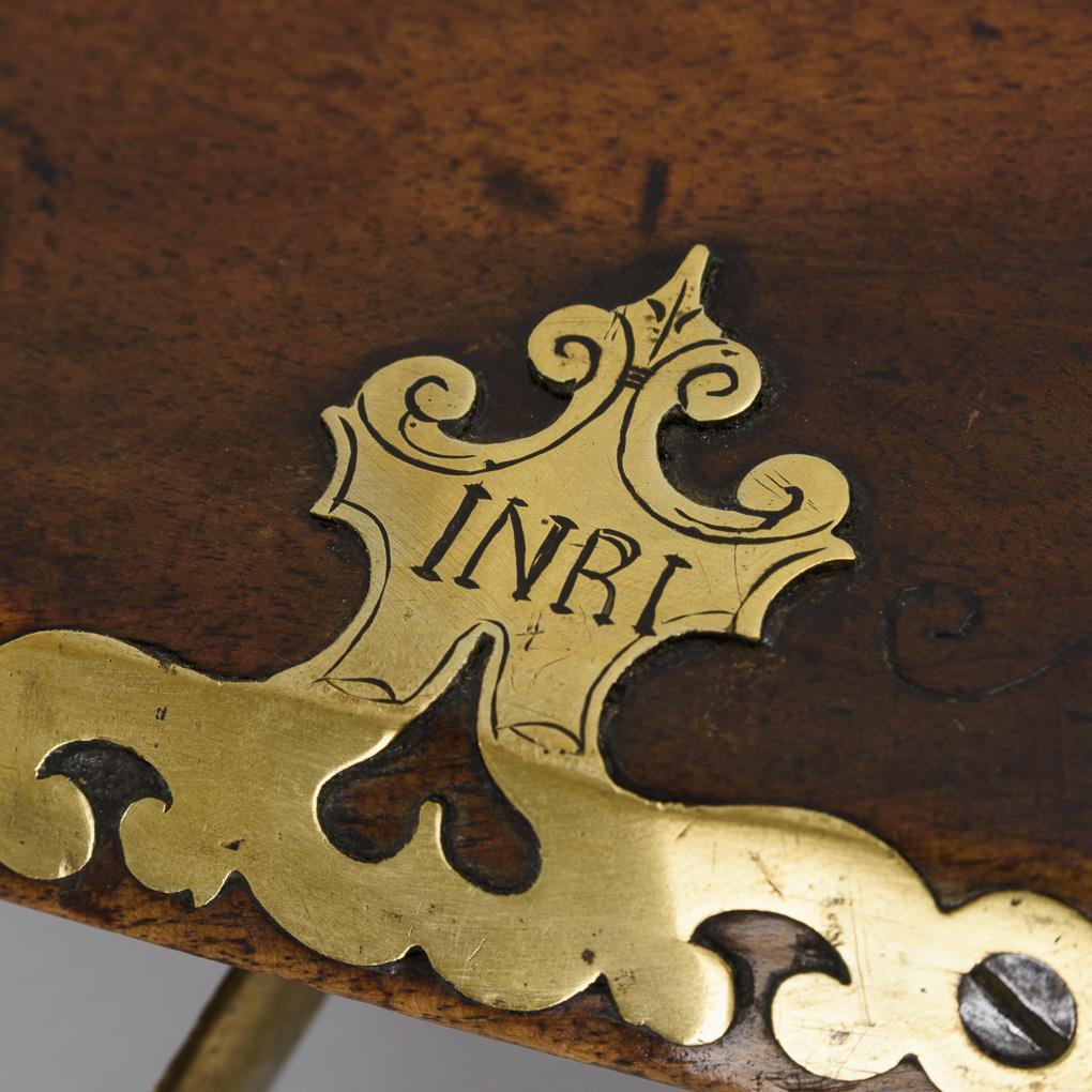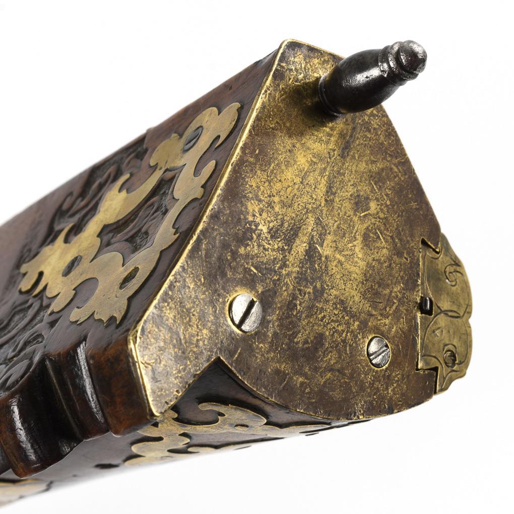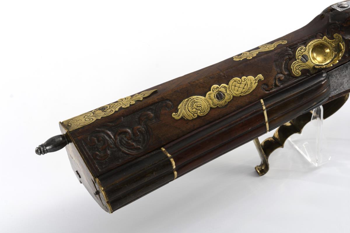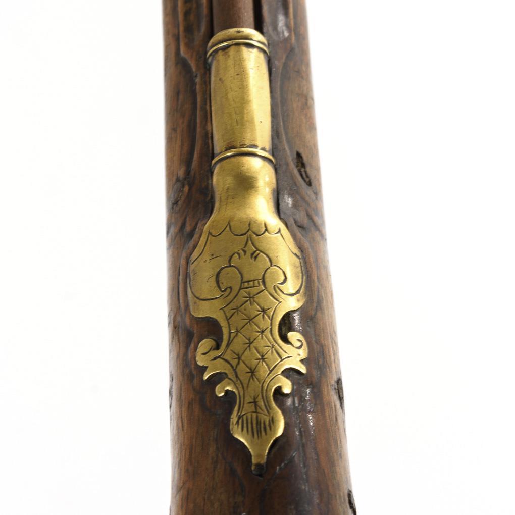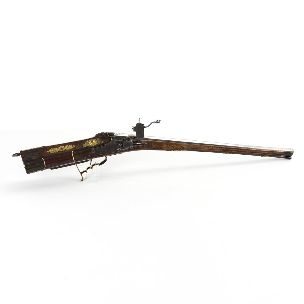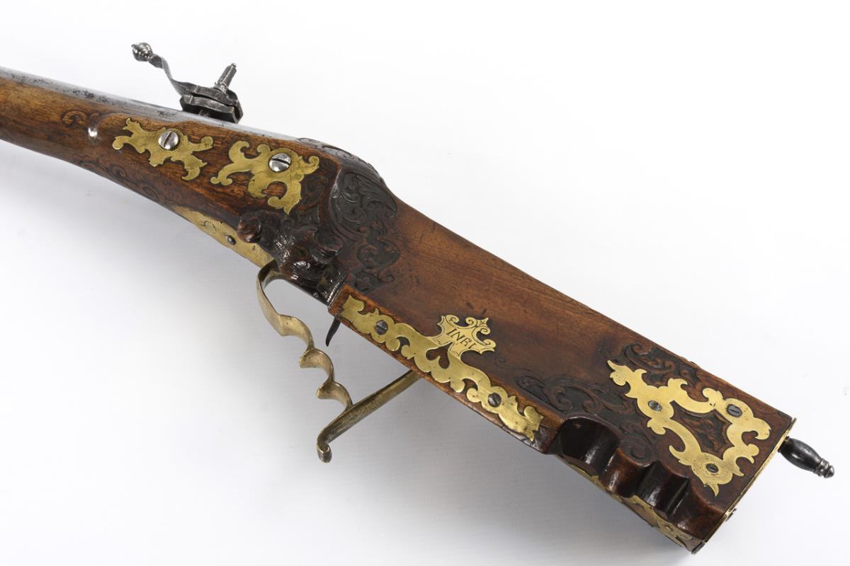Kurzer, gezogener Lauf, Abzugsmechanik mit Stecher. Viele Extras wie Kolbenfach, sehr schöne Daumenauflage und kurzer Kolbenschutz, der das direkte Aufsitzen des Kolbens auf der Erde beim Ladevorgang verhindert. Schieber zum Abdecken der Radöffnung. Teile des Schaftes mit barocken Schnitzornamenten, Schloss und einige Messingeinlagen graviert. Funktion nicht geprüft. Waffe restauriert, Ladestock ergänzt.
