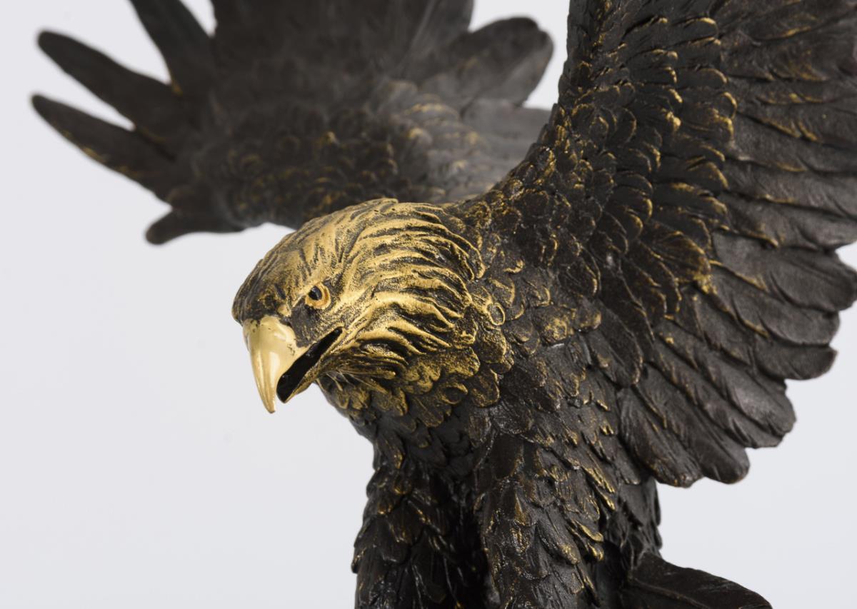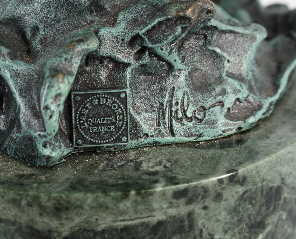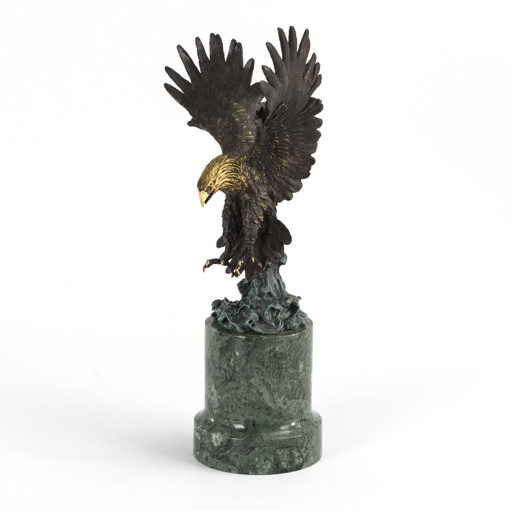 Bronze braun und türkisfarben patiniert/gefasst, teils goldfarben belassen, grüner Marmorsockel. Bezeichnet, Gießermarke "L'Art Bronze Qualité France". H 33,5 / 48,5 cm.