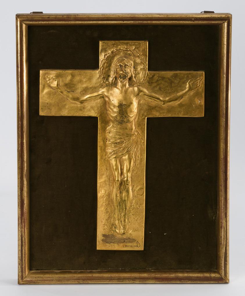 Aufblickender Christus mit nimbusartiger Dornenkrone. 1901 vollendete Bistolfi das Modell für das Kruzifix, das danach in verschiedenen Versionen ausgeführt wurde, u. a. für das Grab von Riccardo Brayda in Villarbasse, das Metzger-Dorna-Grabmal in Turin und das Mausoleum der Vittoriale degli Italiani. Oberfläche fleckig, Rahmen berieben.