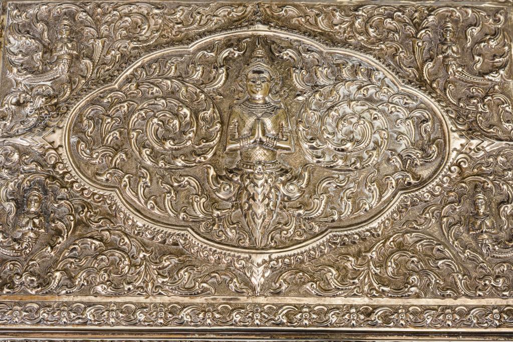 Reich reliefierte Zigarrendose mit Göttin und dichter Rankenzier. Innen mit Holz ausgekleidet. Gebrauchsspuren, 1 Fuß gelötet.