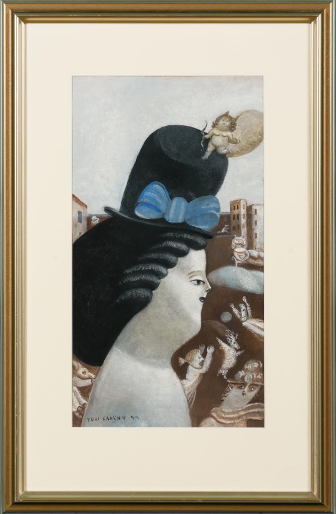 Frau im Profil mit hohem Hut in einer Stadtlandschaft mit mehreren Figuren.