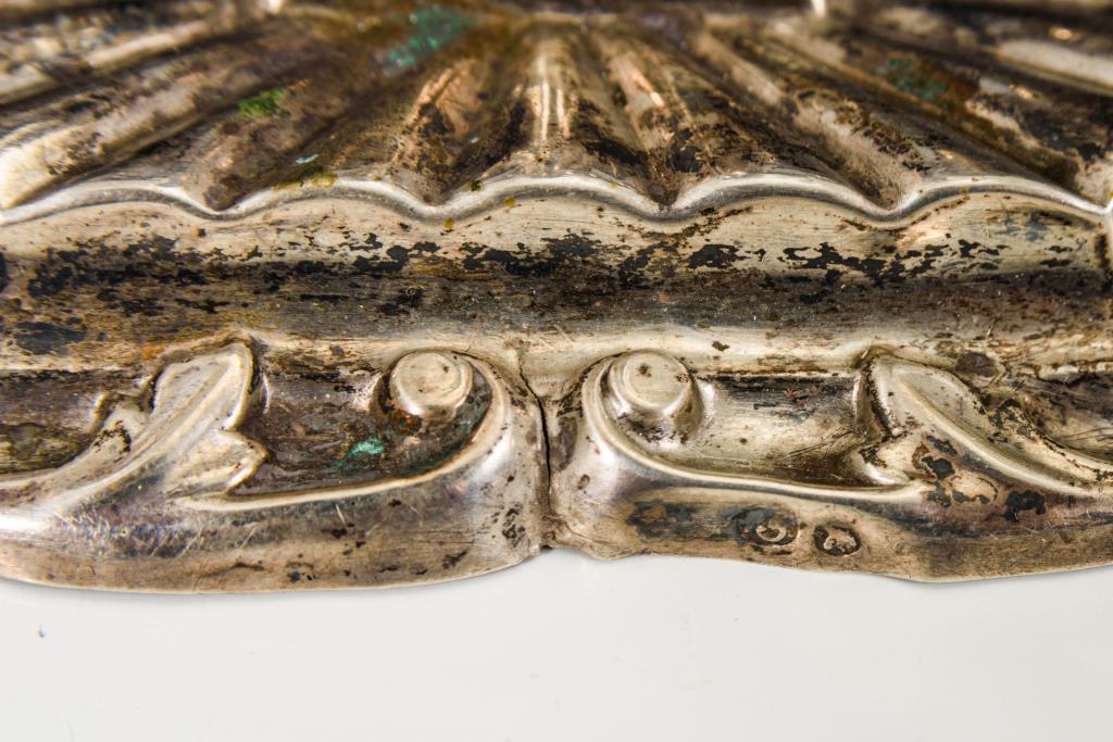 2 blütenförmige, weiße Schälchen mit Linsenschliff, auf Silbergestell mit Balusterschaft und 2 geschwungenen Armen. Altersspuren, Lötstellen, Glas mit Randchips.