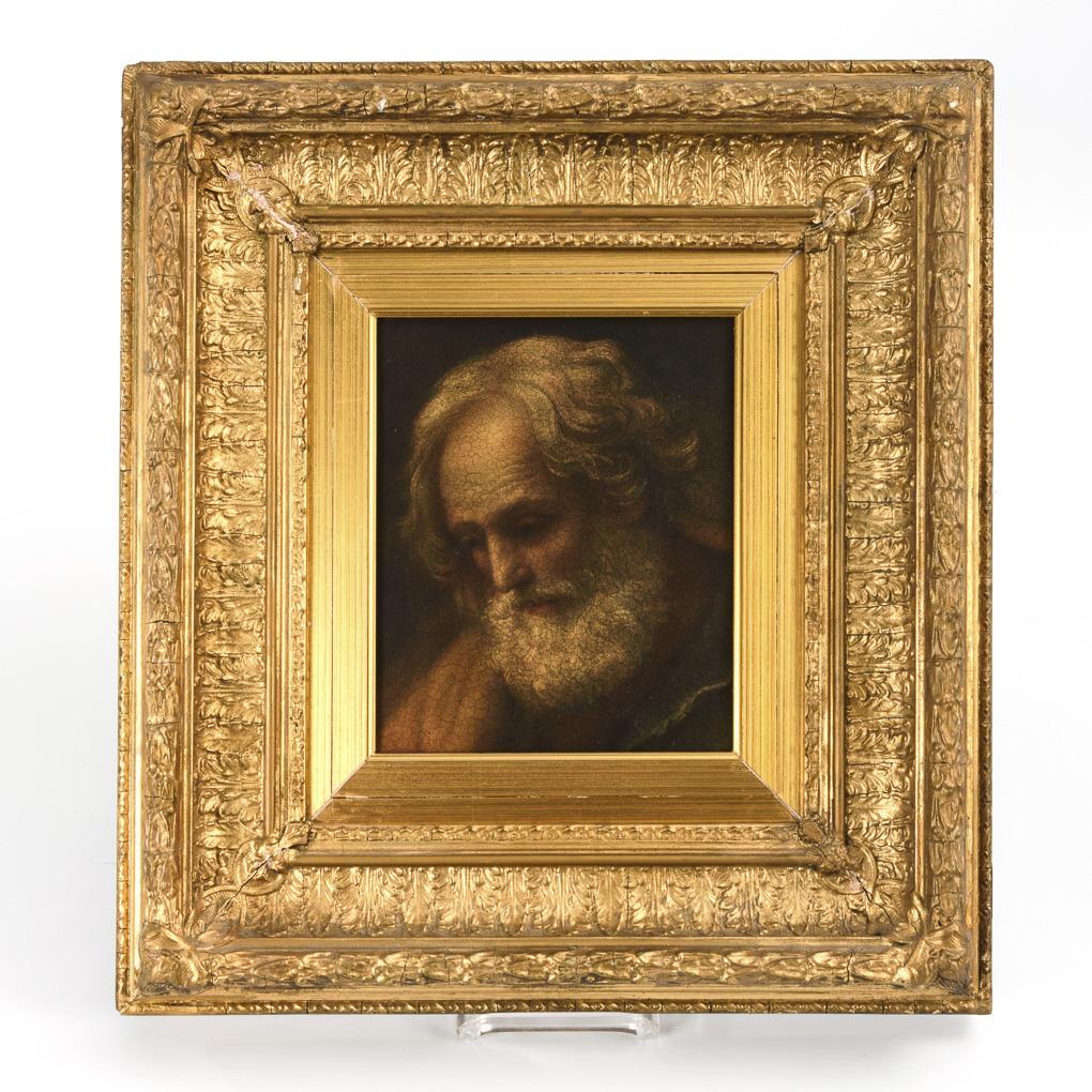 Profilierter Rahmen mit Blattfriesen und Eckauflagen sowie jüngere Binnen-Goldleisten. Druck mit Männerporträt (Apostel?). Einige wenige Alters-/Gebrauchsspuren, teils überbronziert.
