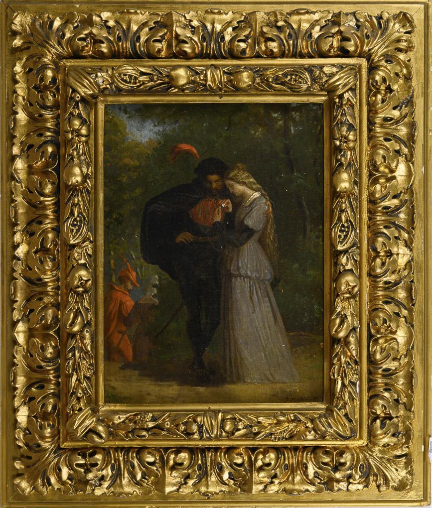 Undeutlich signiert: Historismus Gemälde mit Liebespaar