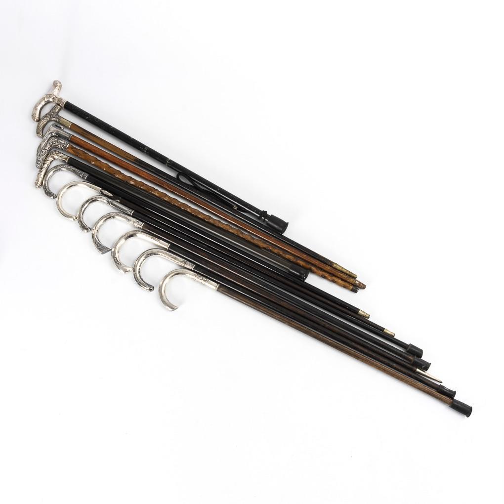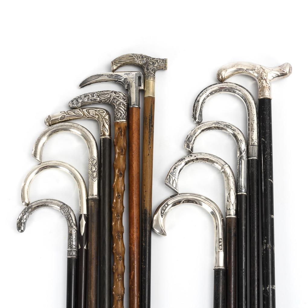 5x Silber gepunzt, 7x versilbert. Schüsse aus Holz meist ebonisiert, 1 Knotenstock, 1x Malakka. Zwingen meist Metall, teils Gummi. L 73 - 91 cm.