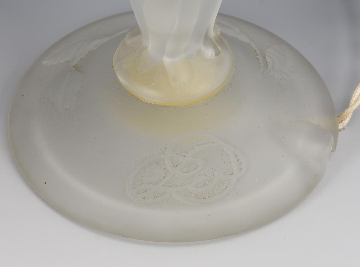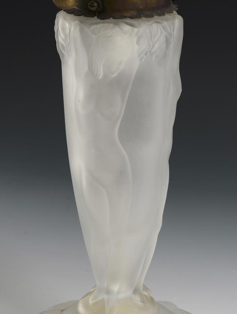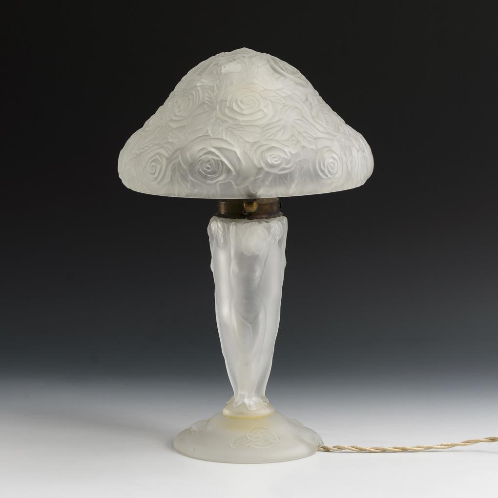 Rundfuß mit Rosenzweigen, Schaft mit 3 Frauenakten, pilzförmiger Schirm mit Rosenblüten reliefiert. Funktioniert. Minimale Chips am Lampeninnenrand und Fußrand, hier minimale Haarrisse.