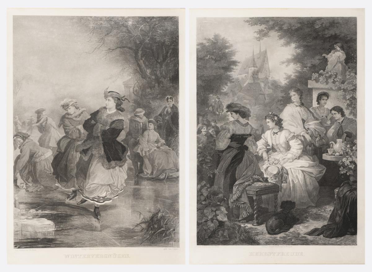 2 Biedermeier-Genreszenen: "Herbstfreude" und "Wintervergnügen"