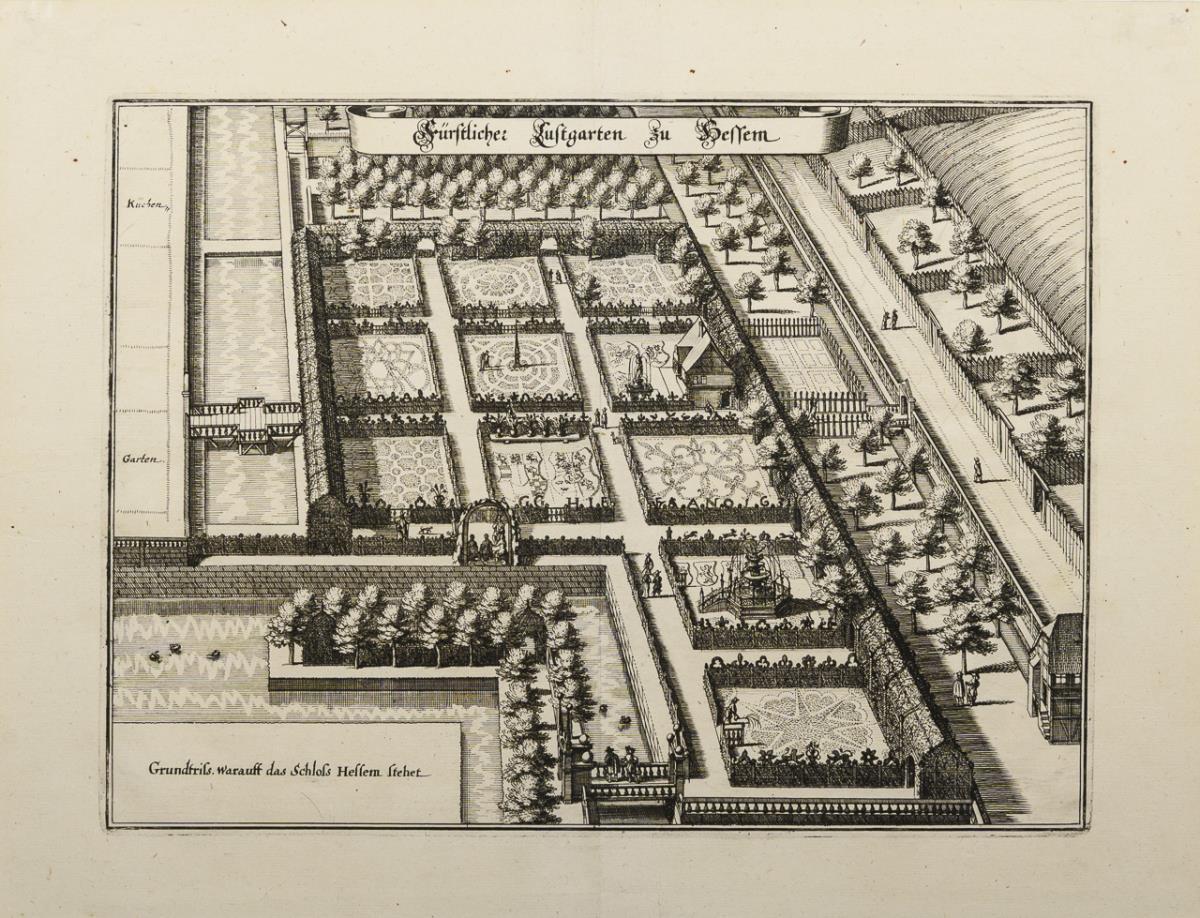 Seltene Darstellung der barocken Gartenanlage der Schlossanlage Hessen in Osterwieck, Sachsen-Anhalt, betitelt "Fürstlicher Lustgarten zu Hessen"; einzige Darstellung einer einzelnen Gartenanlage aus "Topographia Germaniae", 1642 - 1659. Hinterklebte Bugfalte, minimal griffspurig.