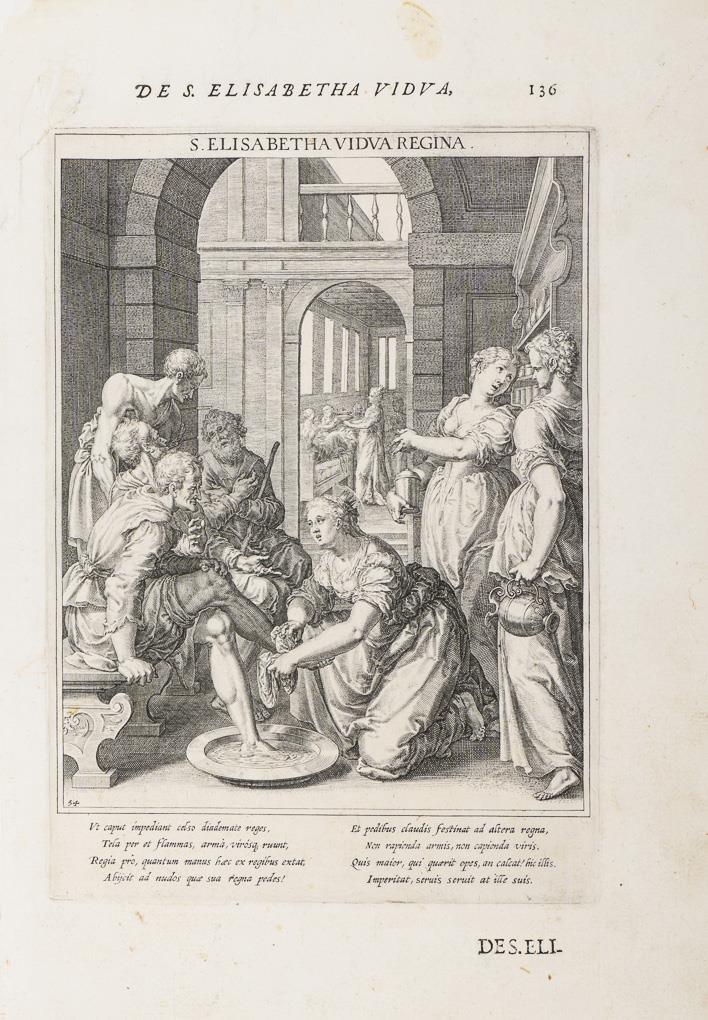 Darstellung der Heiligen Elisabeth von Thüringen (1207 - 1231) als Sinnbild tätiger Nächstenliebe beim Waschen von Füßen von Bedürftigen, betitelt "S. Elisabetha Vidva Regina", Begleitvers in lateinischer Sprache; Bild 136 aus der lateinischen Erstausgabe von Matthäus Raders "Bavaria Sancta", 1615. Etwas fleckig, griffspurig, oben links mit Riss und abgerissener Ecke.
