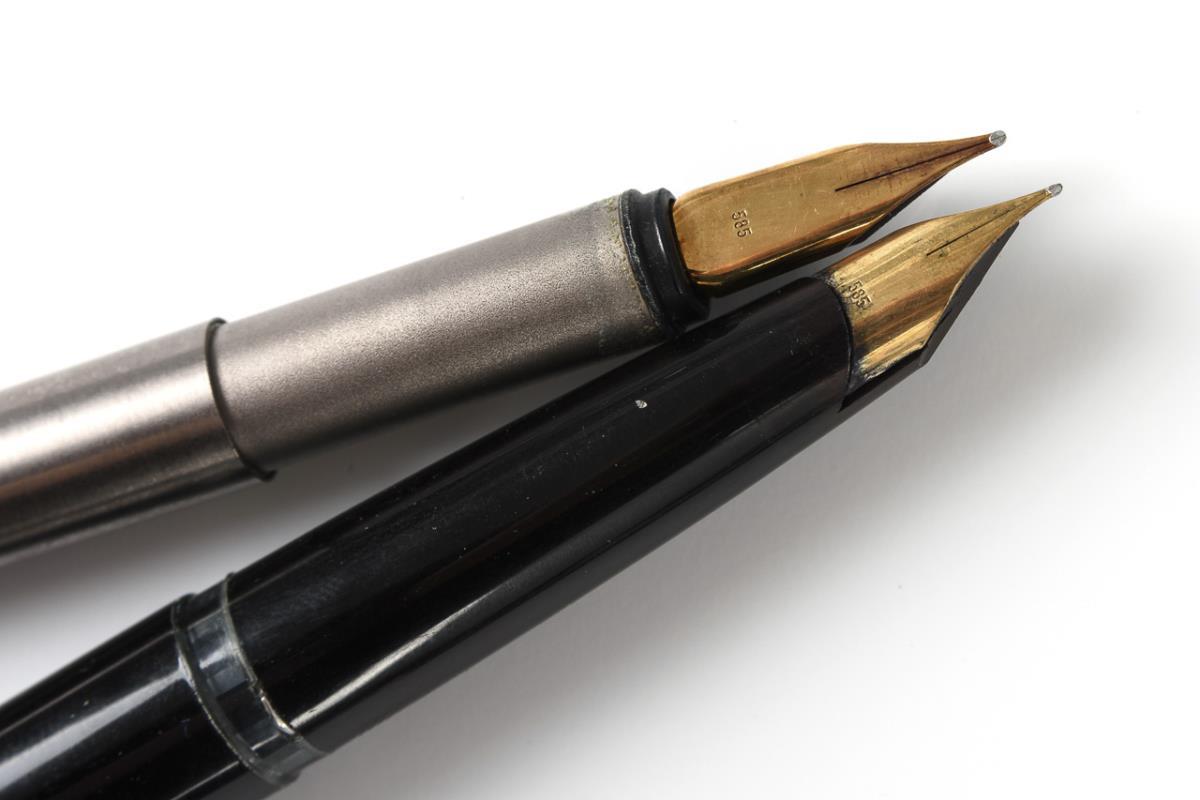 Edelstahl gebürstet, schwarzer Kunststoff, Messing vergoldet, 2 Goldfedern je 585 gepunzt. L maximal 14,5 cm.