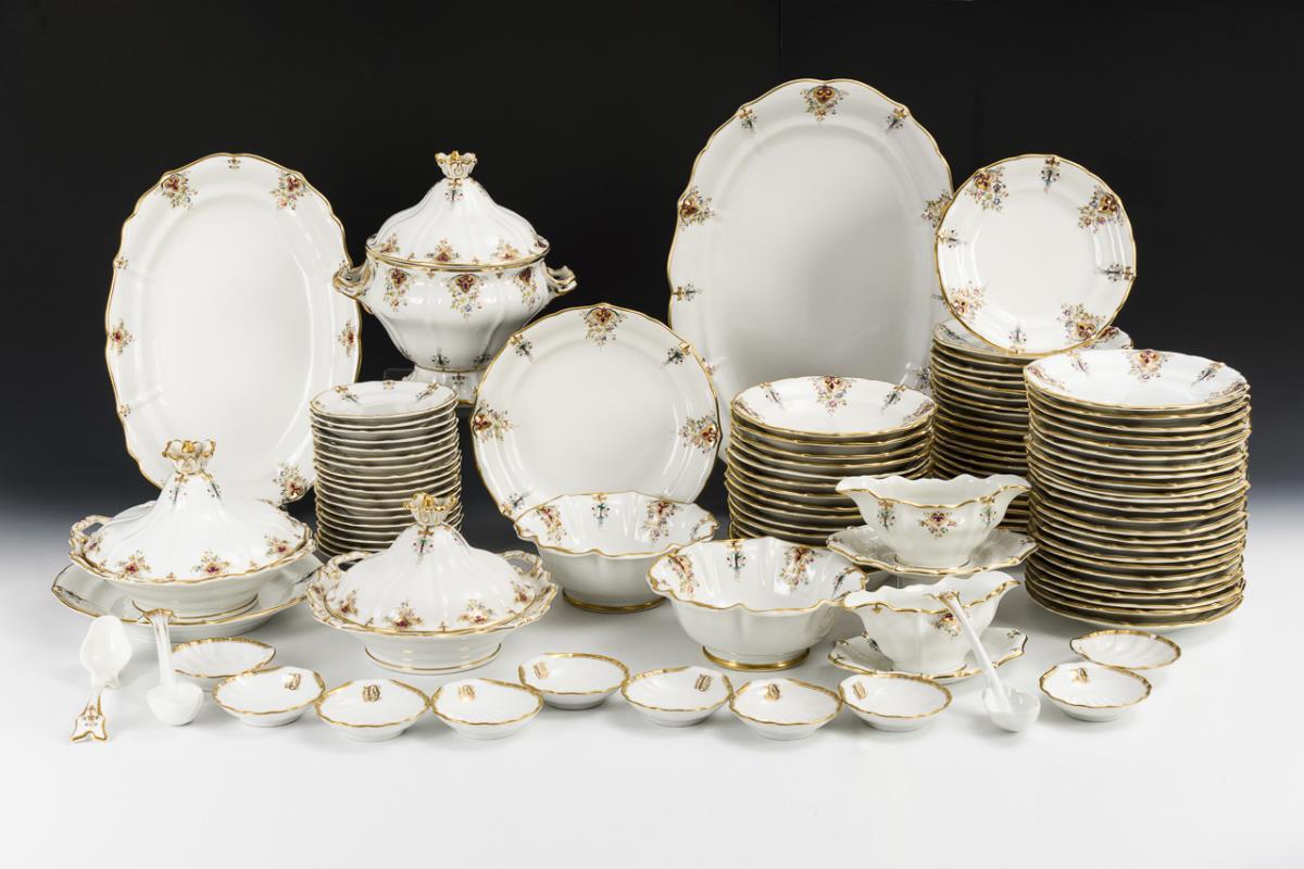 106 Teile. 48 Speiseteller (Ø 23,5 cm), 15 Suppenteller, 19 Dessertteller, 1 Terrine (H 29,5 cm), 2 Saucieren, 2 Gemüseteller, 2 Schüsseln, 2 Ovalplatten (L 43,5 und 52 cm), 2 Deckelschüsseln, 3 Servierlöffel. Als Zugabe 10 ergänzte Muschelschalen mit Monogramm (L 11 cm), diese gemarkt Christian Fischer, Pirkenhammer . Partiell minimaler Goldabrieb, Chip am Rand einer Muschelschale.