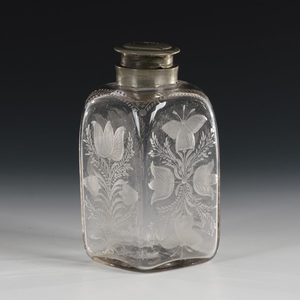 Vierkantflasche mit zinnmontiertem Hals, kleinem Zinndeckel innen und Zinnschraubdeckel. Allseitig graviert mit Blumenbuketts.