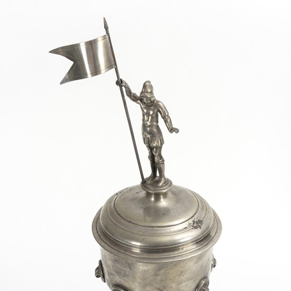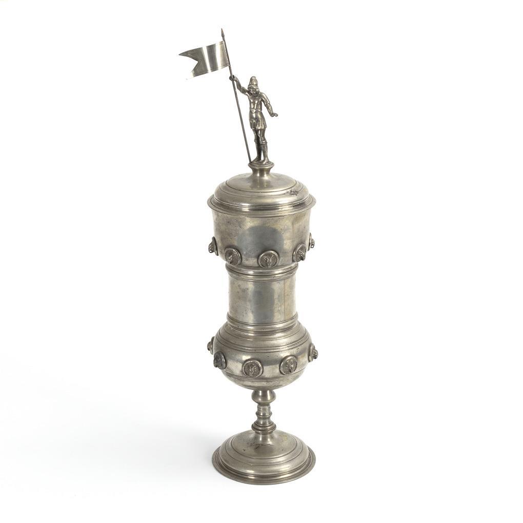 Hoher gefußter Pokal mit 2 Reihen von je 8 Löwenköpfen sowie Landsknechtfigur mit Fahne auf dem Passdeckel. Anhänger fehlen, teils etwas Zinnpest.