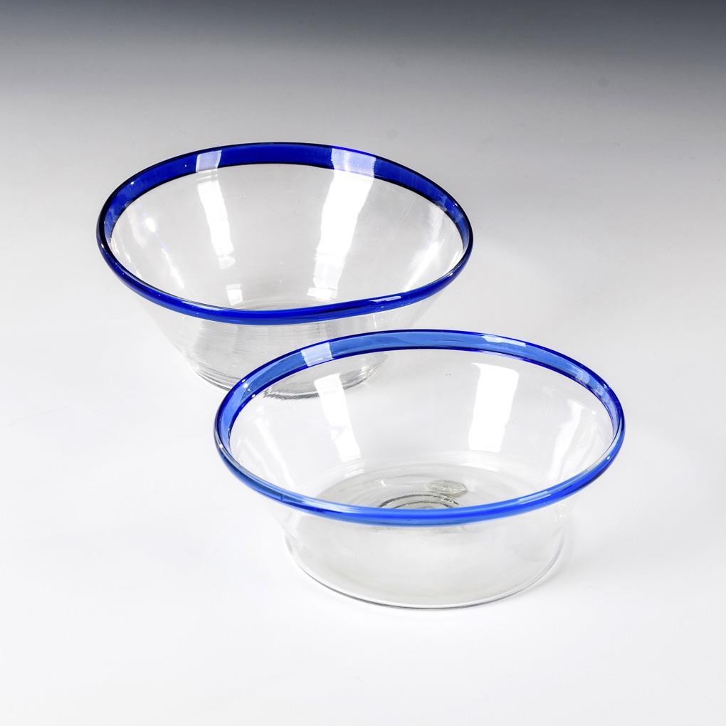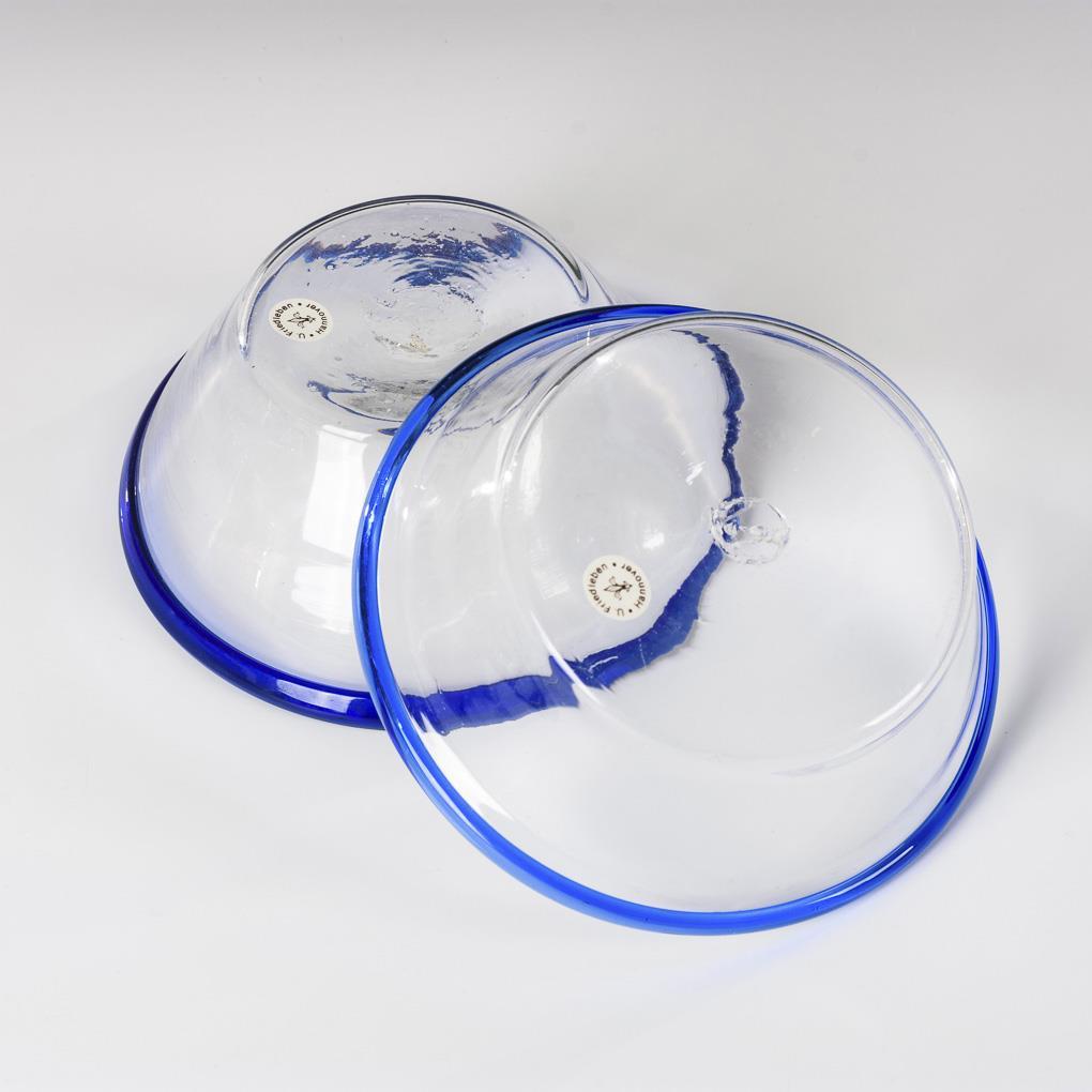 Sauerrahmschalen. 1x konische Schale, 1x Kraterschale, mit angeschmolzenen blauen Rändern.