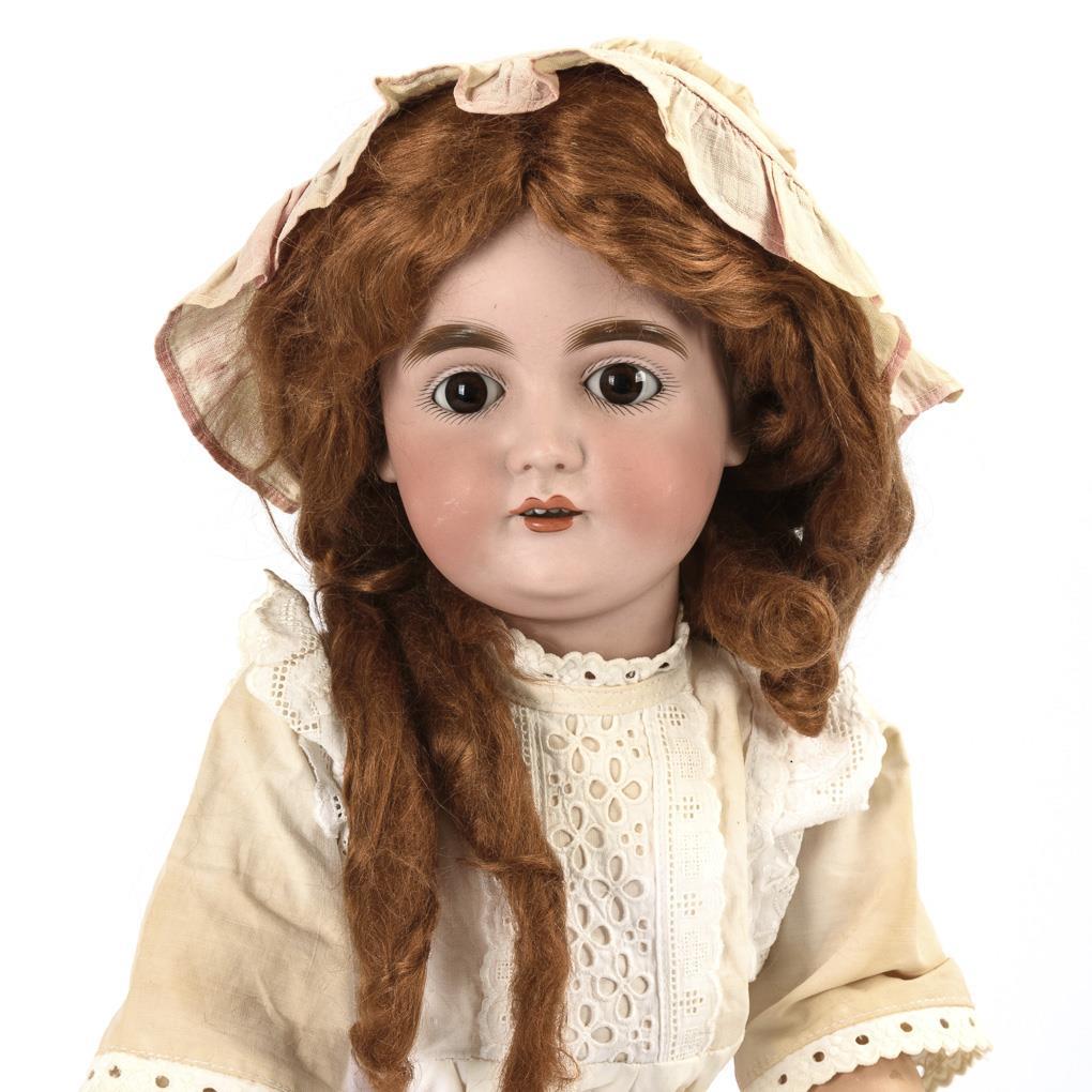 Kurbelkopf, braune Schlafaugen, lange Mohairperücke. 15-teiliger Gliederkörper. Weißes Kleid mit rosa Schleife, rosa Haube, schwarze Wachstuchschuhe. Kopf durchleuchtet: ohne Defekte, lediglich etwas Perückenpull. Arme und Hände übermalt (und eventuell passend ergänzt).