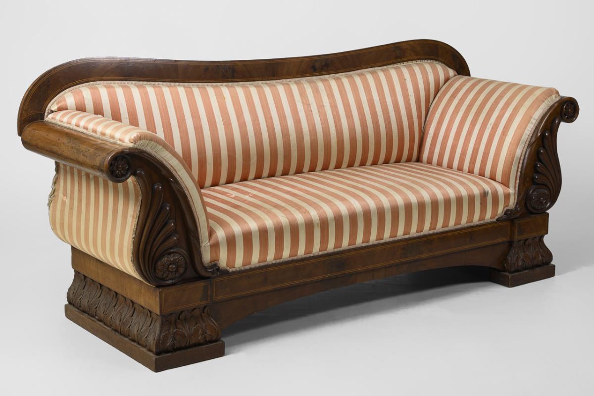 Vollgepolstertes Sofa mit leicht geschwungener Rückenlehne und s-förmigen Armlehnen mit stilisiertem Blatt-Schnitzwerk, Sockel mit Akanthusblattschnitzereien; rötlich und champagnerfarben gestreifter Bezug. Alters-/Gebrauchsspuren, alt restauriert, inaktiver Anobienbefall, Polster und Bezug ergänzt und mit Defekten.