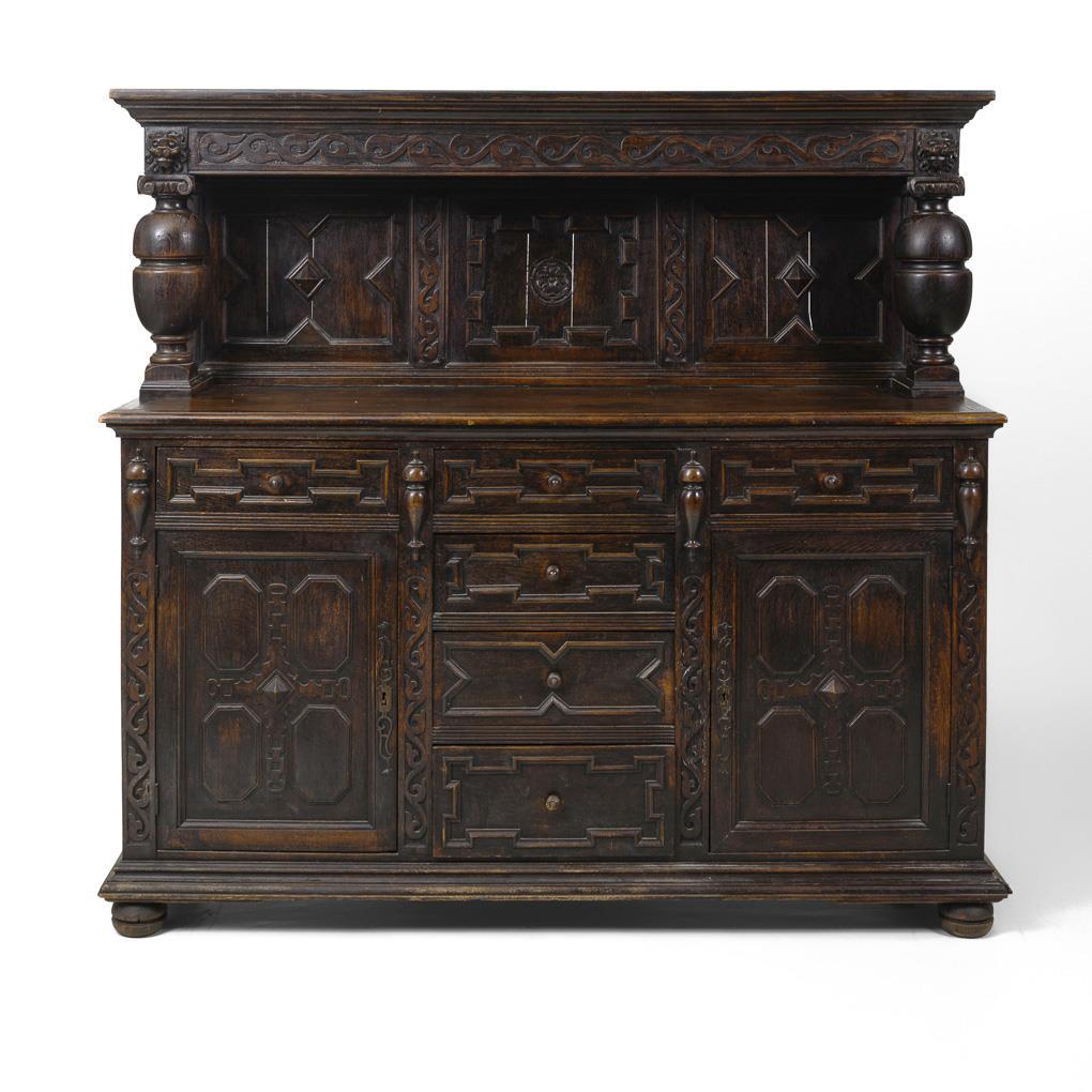 Üppig verzierte Kredenz in barocker, architektonisch gegliederter Formensprache mit offenem, balustergetragenem Aufsatz; reich dekorierter Korpus mit floralem Schnitzwerk; 4-schübiges Mittelstück, flankiert von je 1 Tür mit 1 Kopfschub. Leichte Alters-/Gebrauchsspuren, Türen verschlossen.