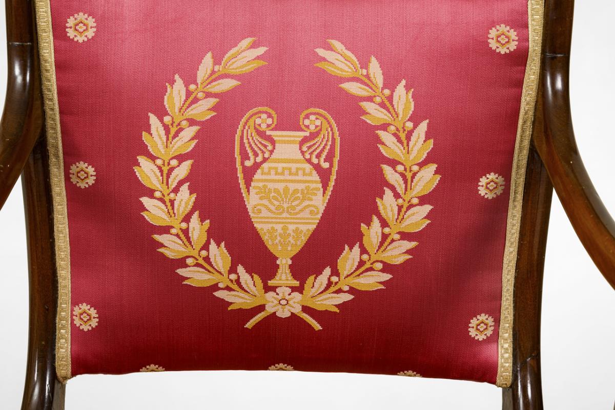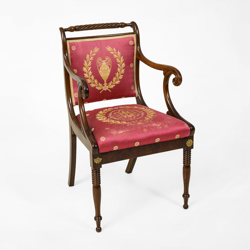 Gepolsterter Lehnstuhl mit volutierten Armlehnen und gedrechselter Schulterlehne, auf konischen Drechselbeinen, roter Bezug mit Amphora und Lorbeerkranz. Gute Erhaltung mit wenigen Alters-/Gebrauchsspuren.