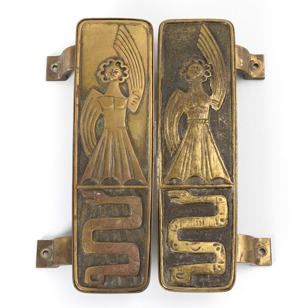Auf dem Griff jeweils ein Engel über einer Schlange in stilisierter Darstellung.