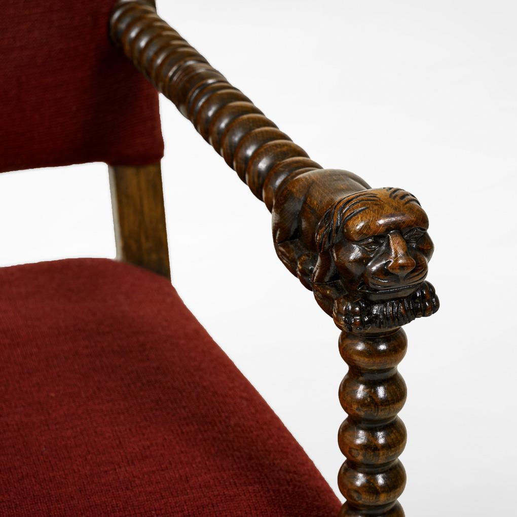 Gepolsterter Lehnstuhl mit gerilltem Drechselgestell, Armlehnen dekoriert mit grotesken Figuren; roter Bezug. Restauriert, Polster und Bezug ergänzt.