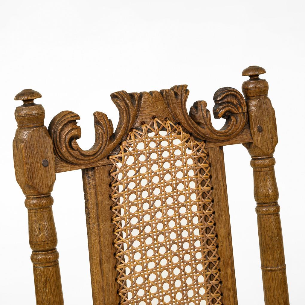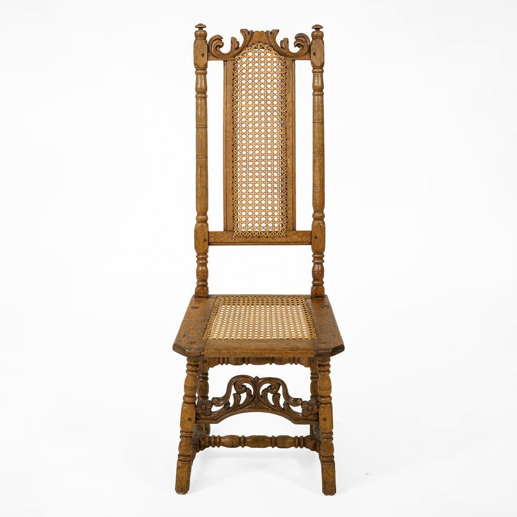 Stuhl mit erhöhter Rückenlehne, auf 4 gedrechselten Beinen mit Fußverstrebung, verziert mit Rocaillen-Schnitzwerk, Lehne und Sitzfläche mit Korbgeflecht. Wohnfertig restauriert.